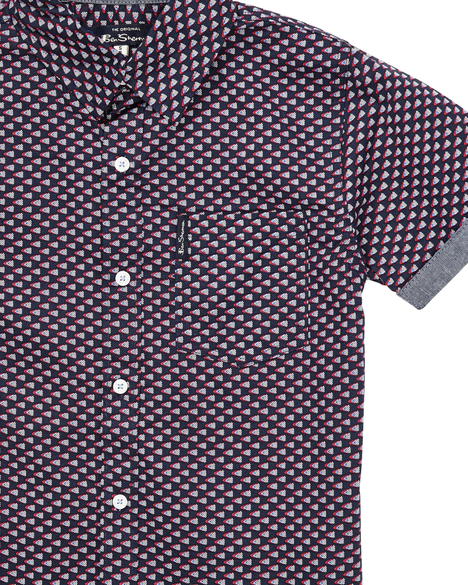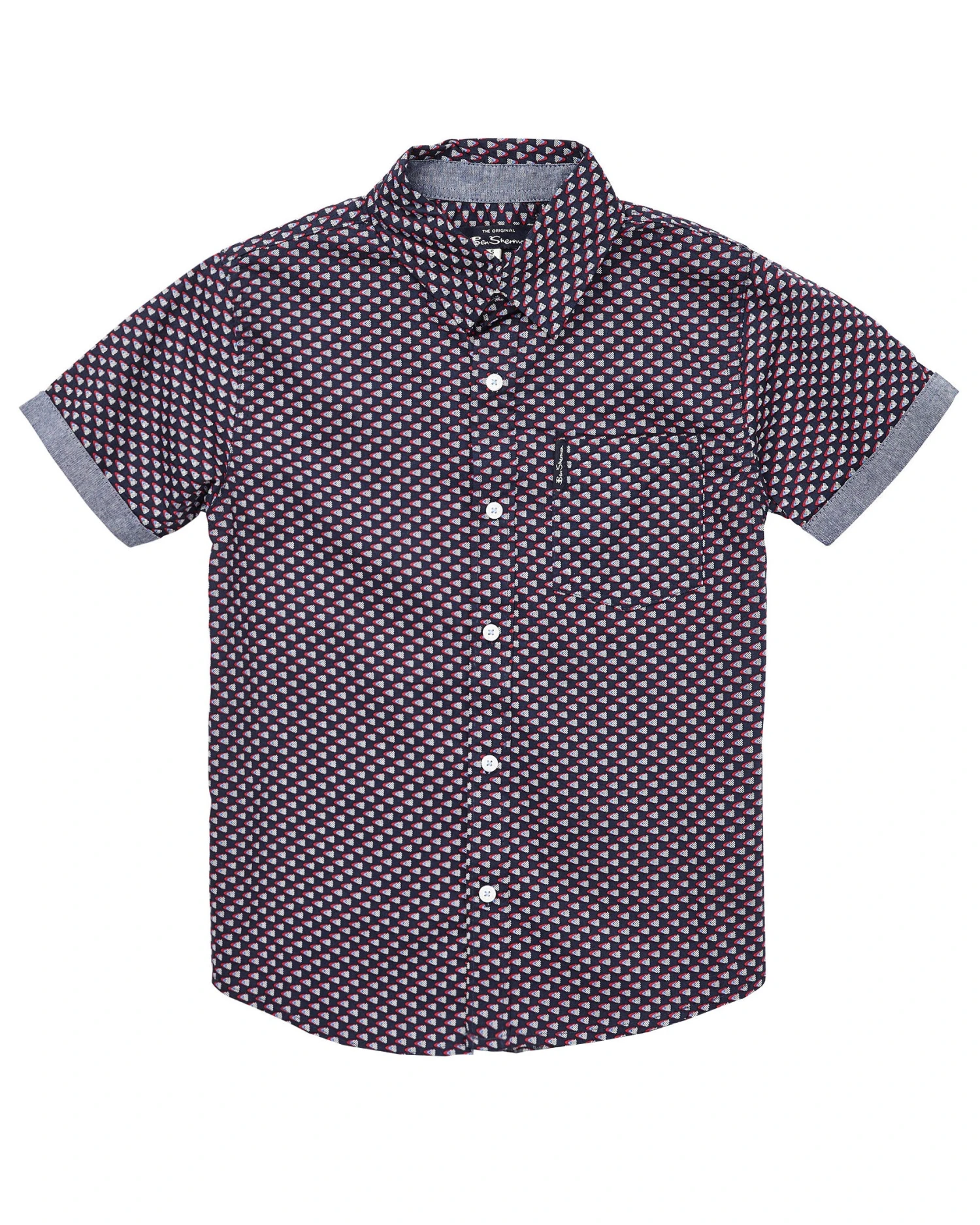 This short-sleeve button-up for your little gent comes in navy and red triangle print.