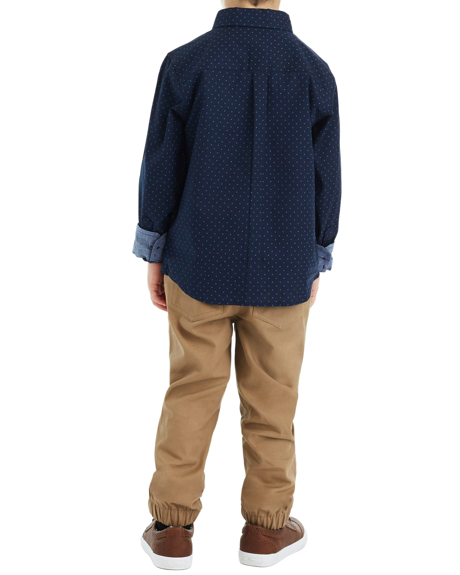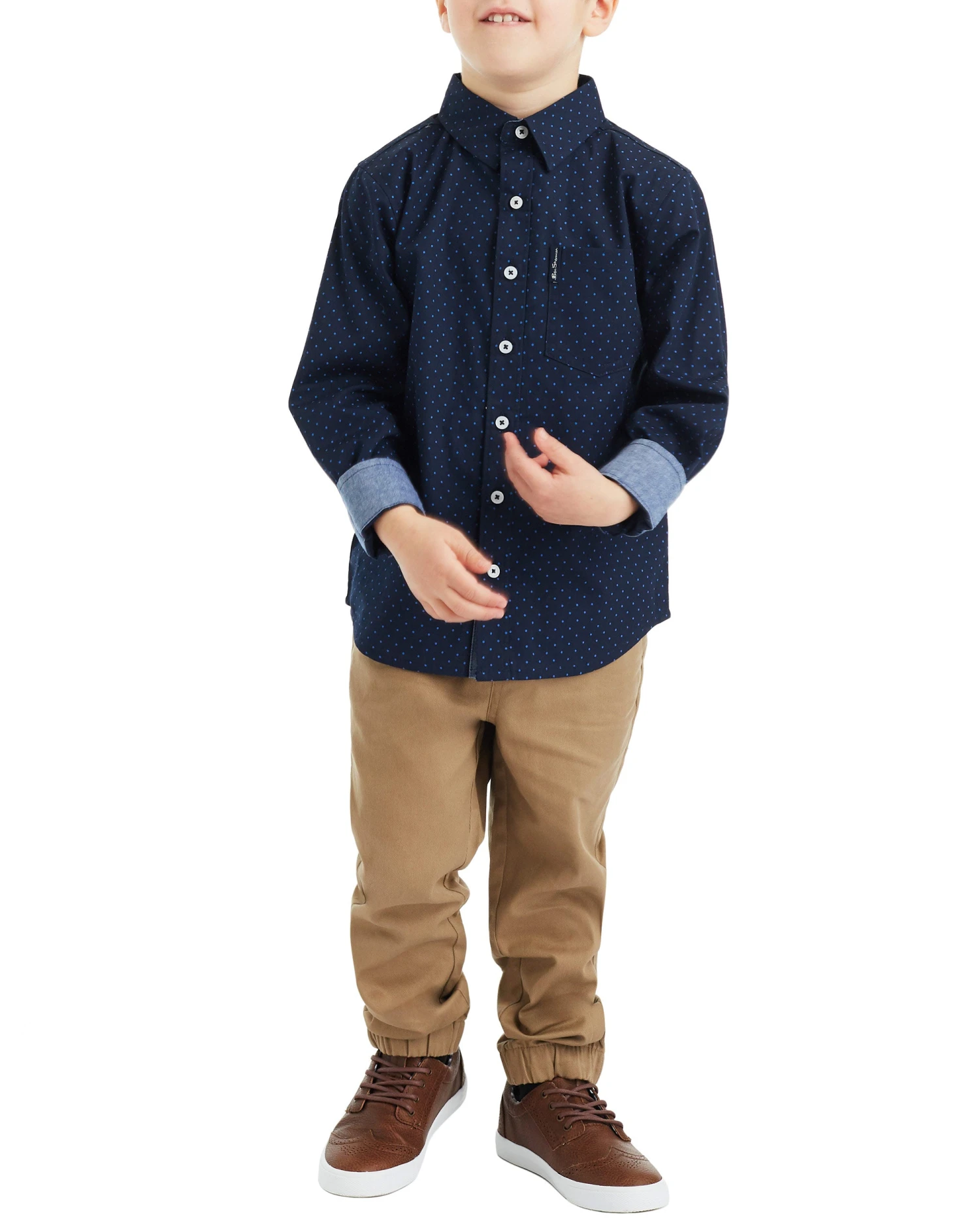 This long-sleeve button-up and pant set makes dressing your little gent a breeze. Chambray cuffs and inner-collar trim add an on-trend accent. A classic button placket and logo tag complete the look.