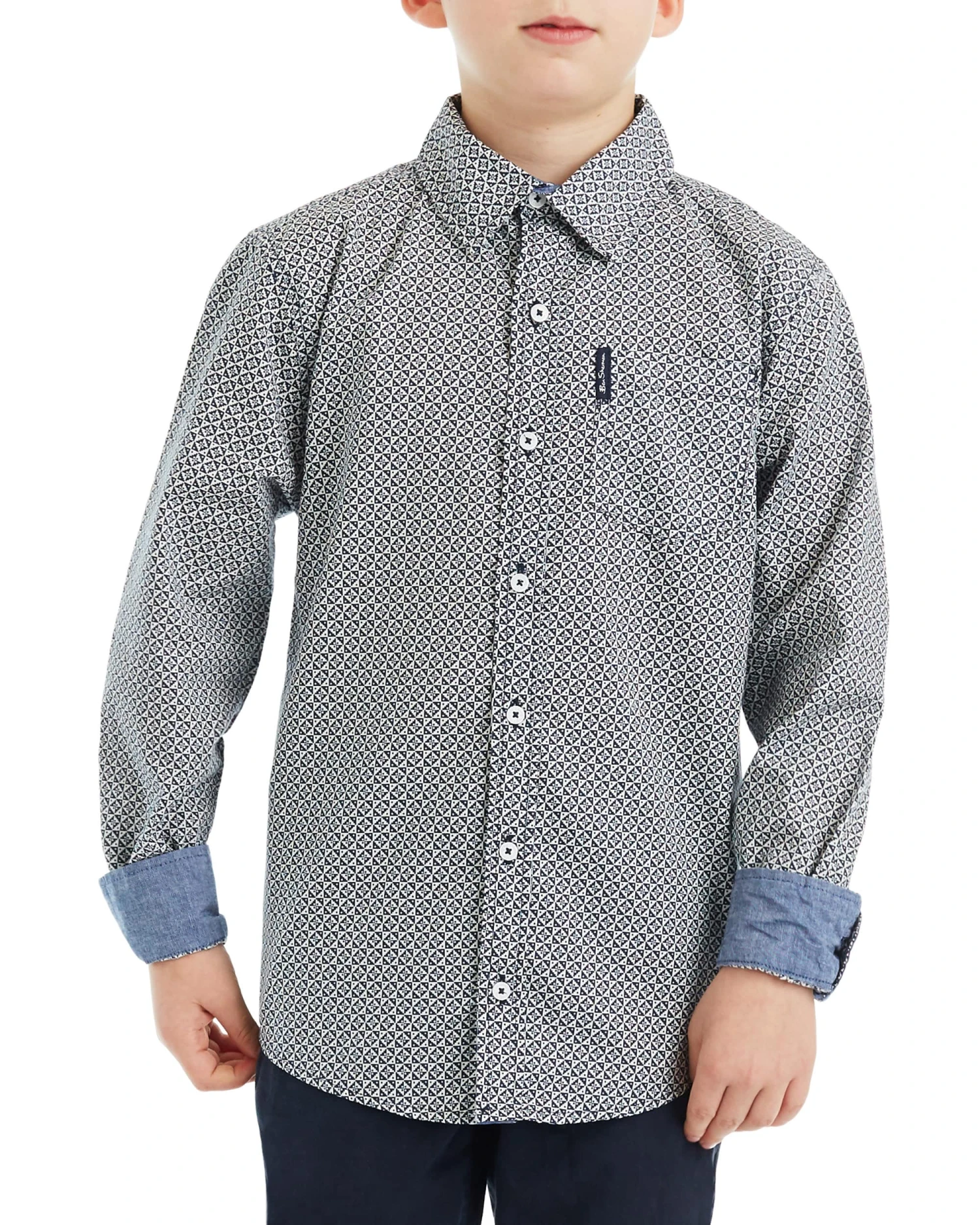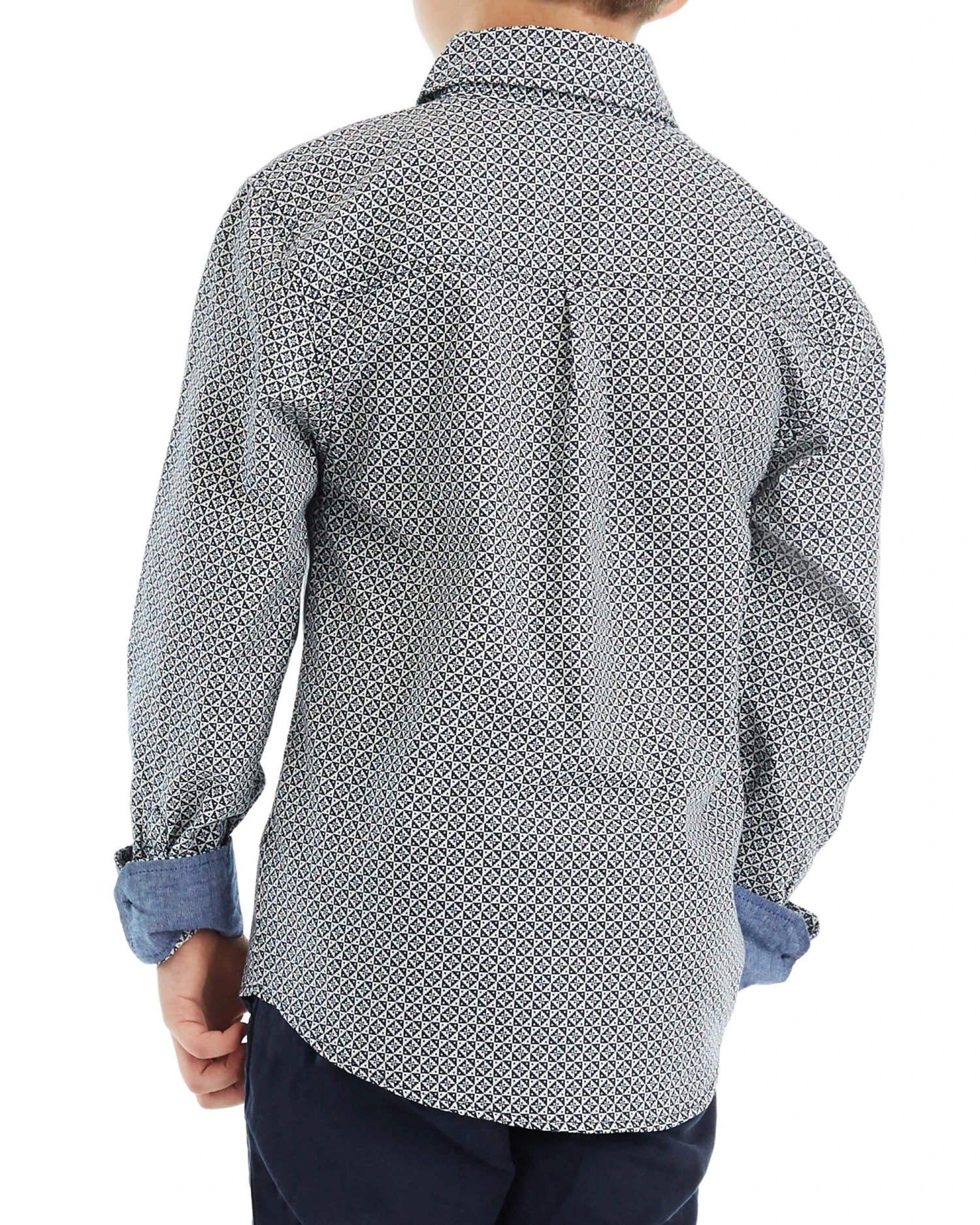 Perfect for the not-so-little-anymore gent in your life, this junior-sized version of our button-up stands out in a cool navy and white triangle print. Chambray cuffs and inner-collar trim add an on-trend accent. A classic button placket and logo tag complete the look.