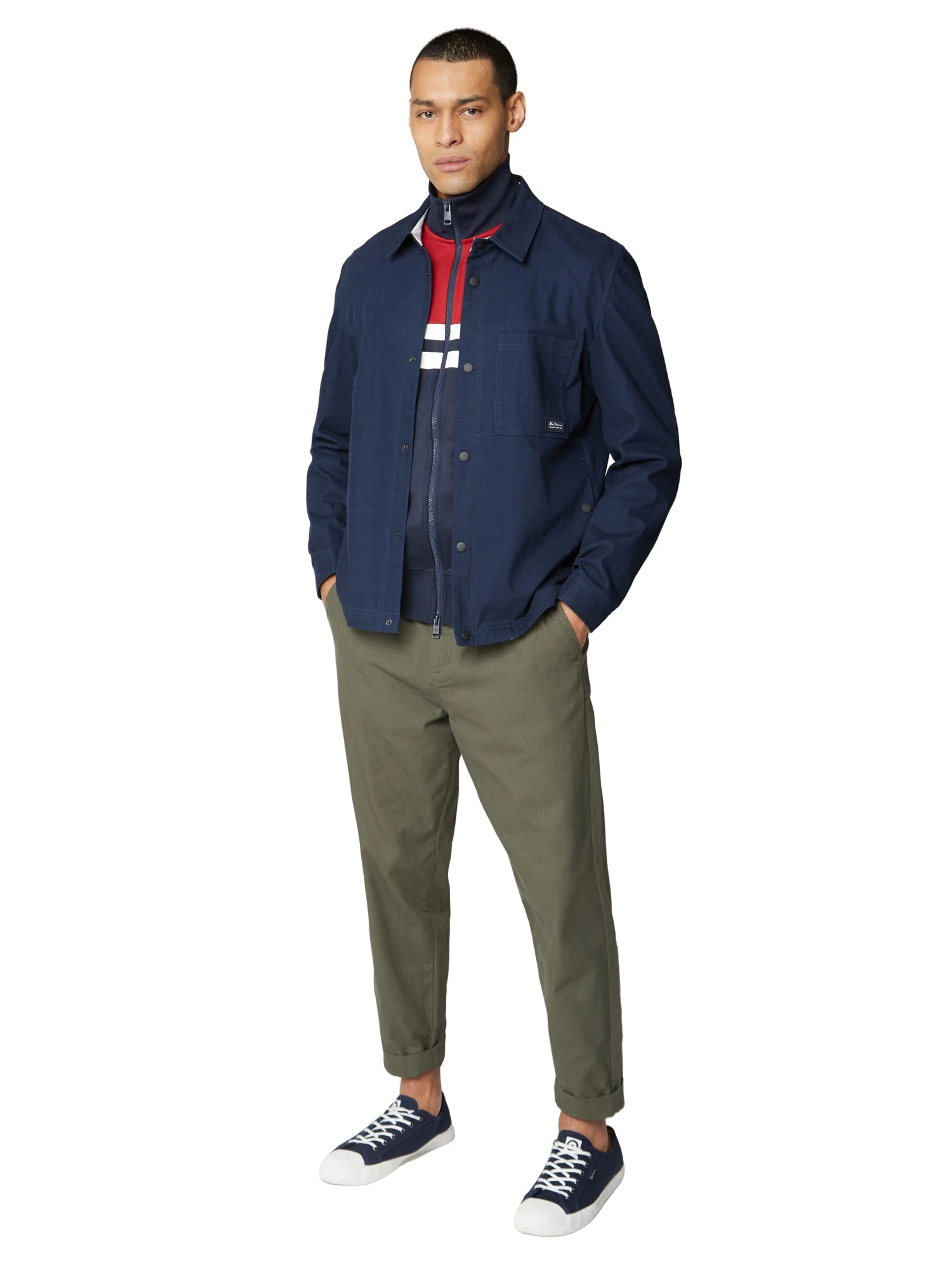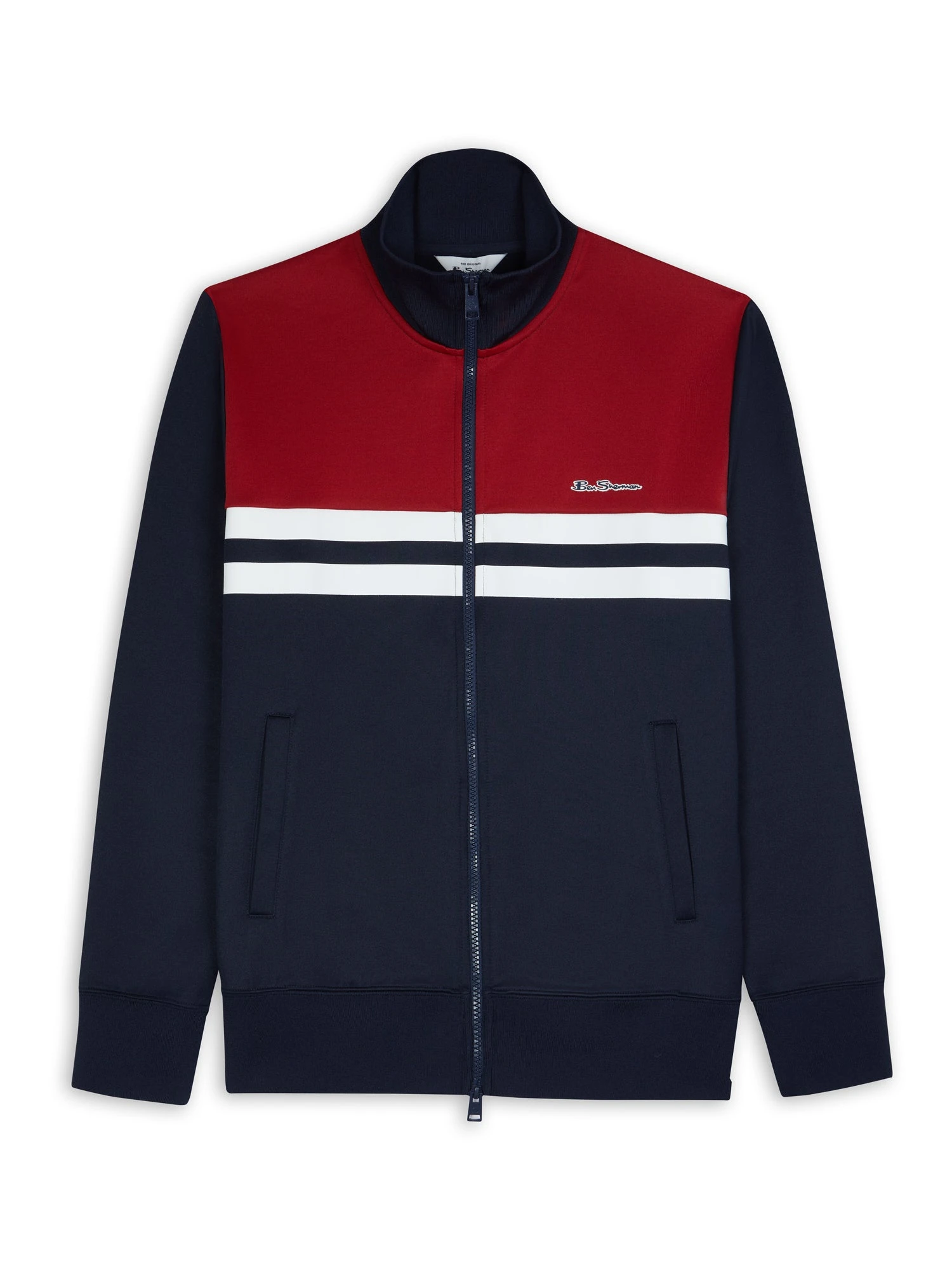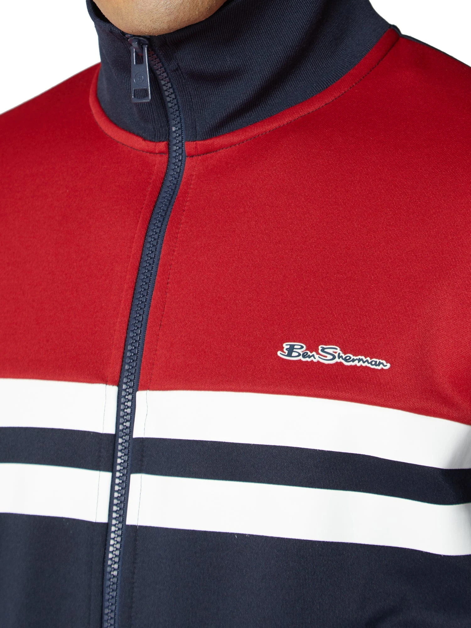 A cool layering piece, our tricot zip-through jacket has a contrast cut-and-sew chest panel and contrast printed stripes across the chest. It features a “Ben Sherman” silicone badge at left chest.