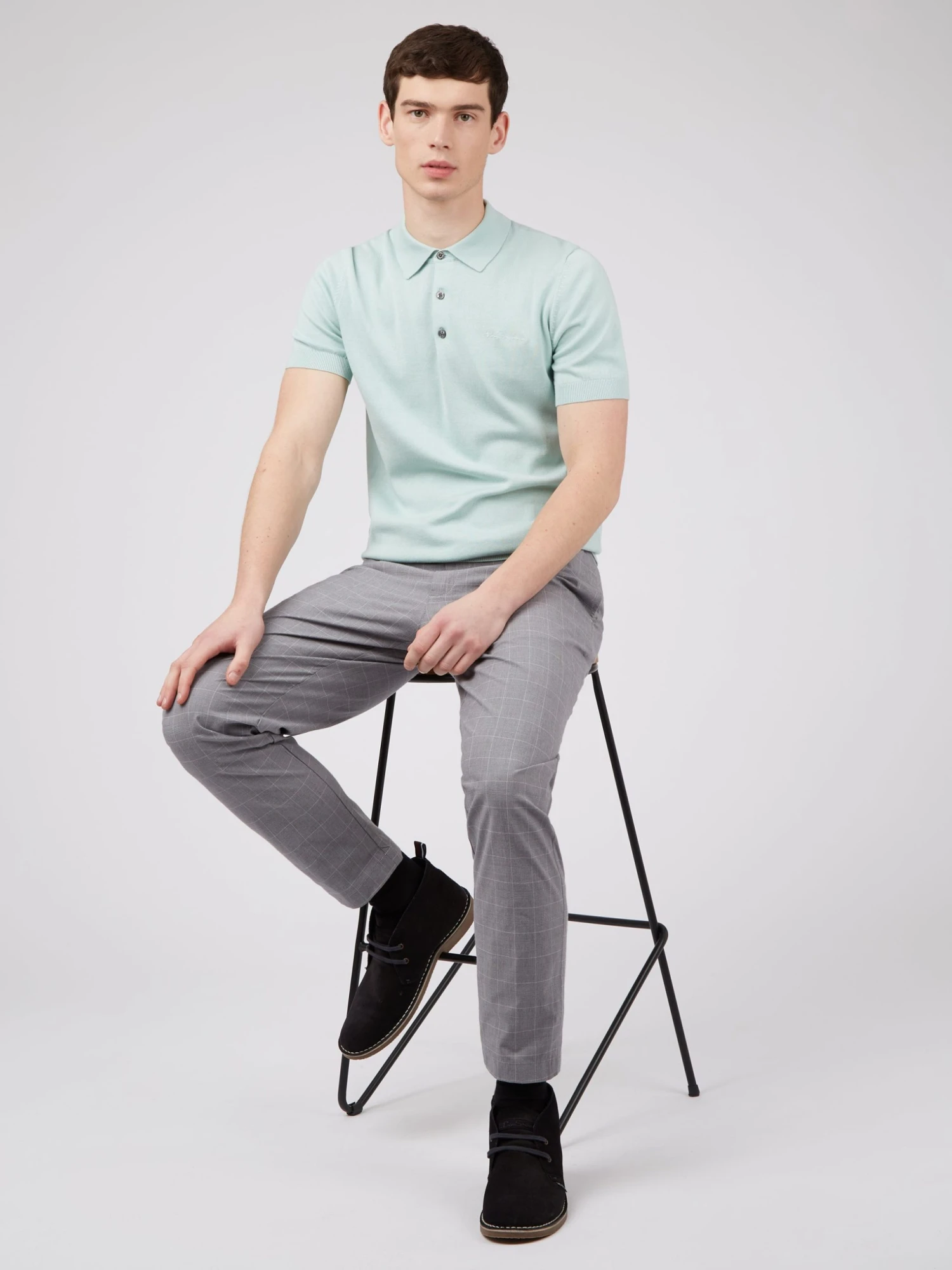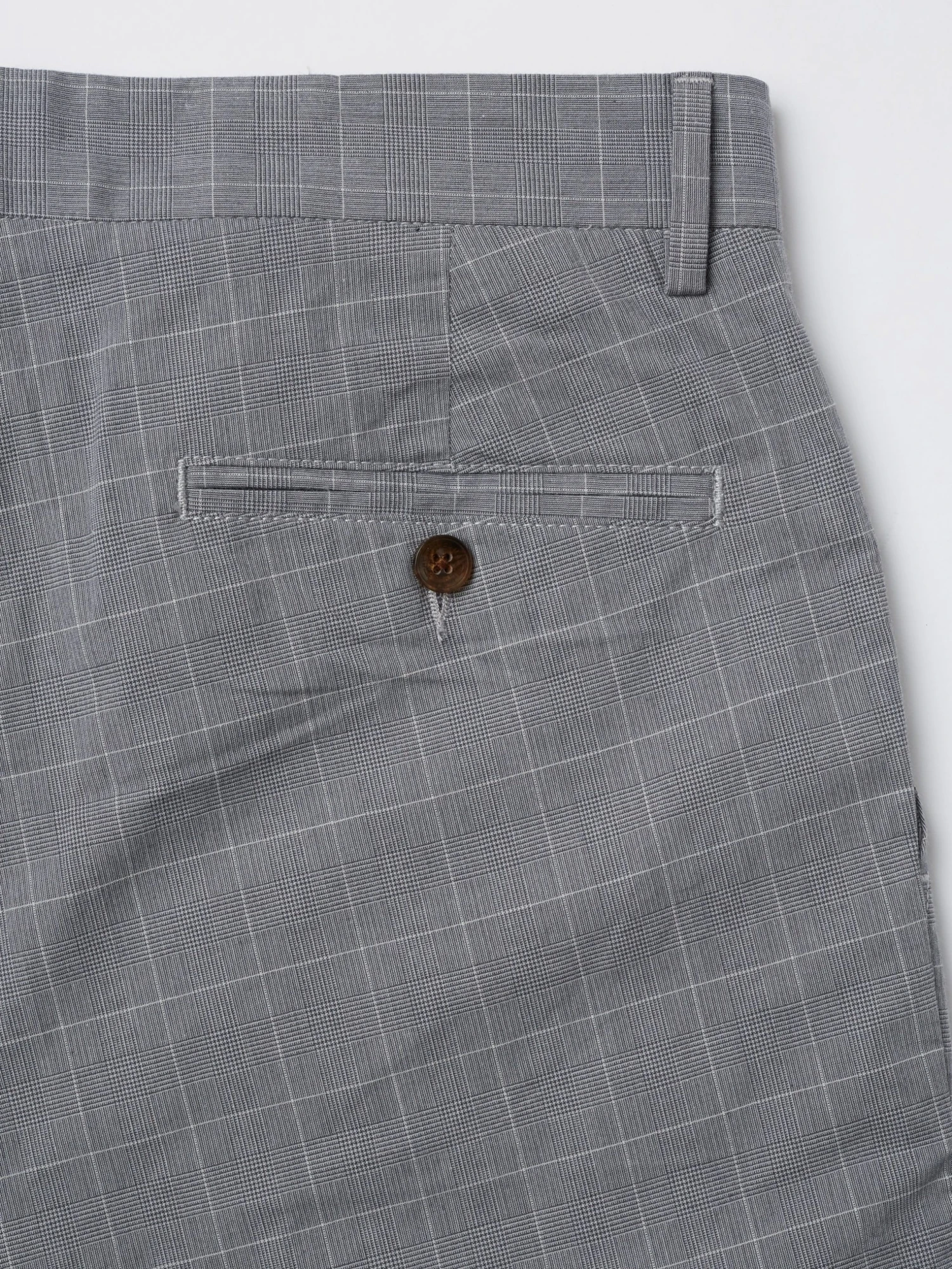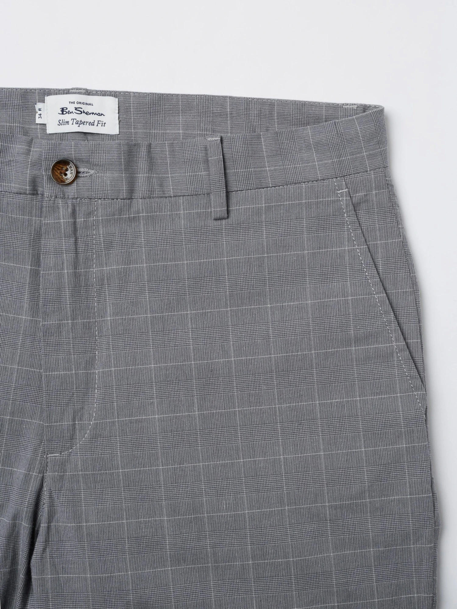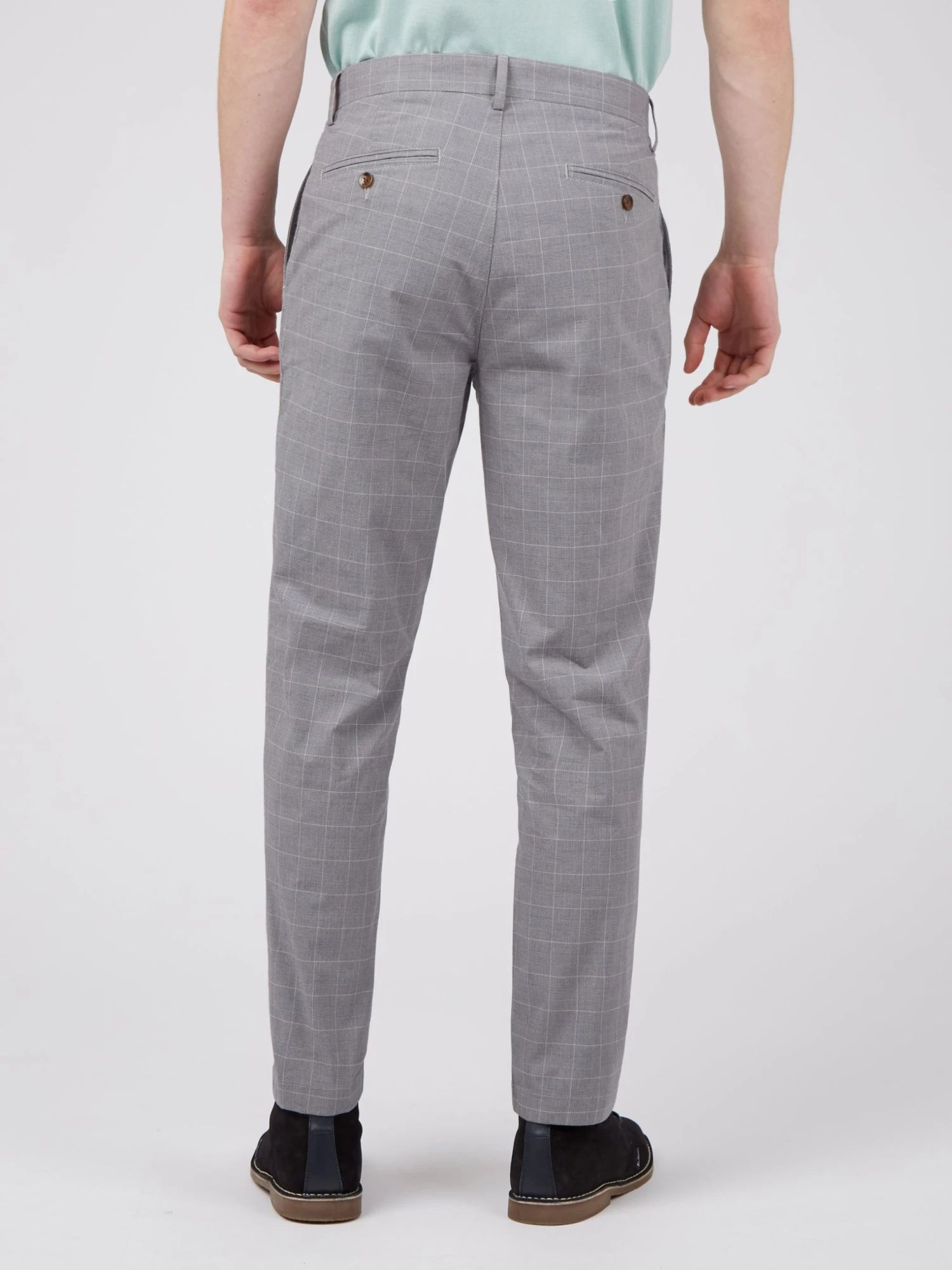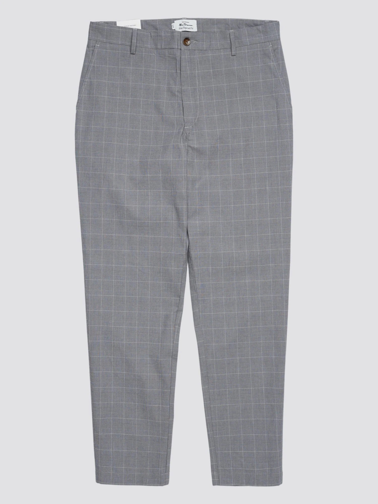 A check design slim taper fit trouser in a cotton fabric. Features include front slanted pockets, button through jet pockets at the back and a Ben Sherman branded woven badge at the center back.