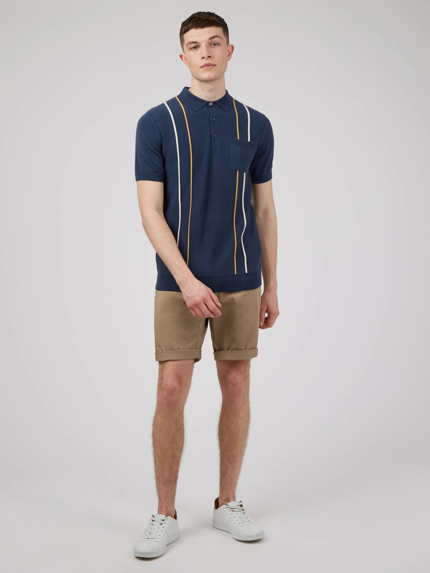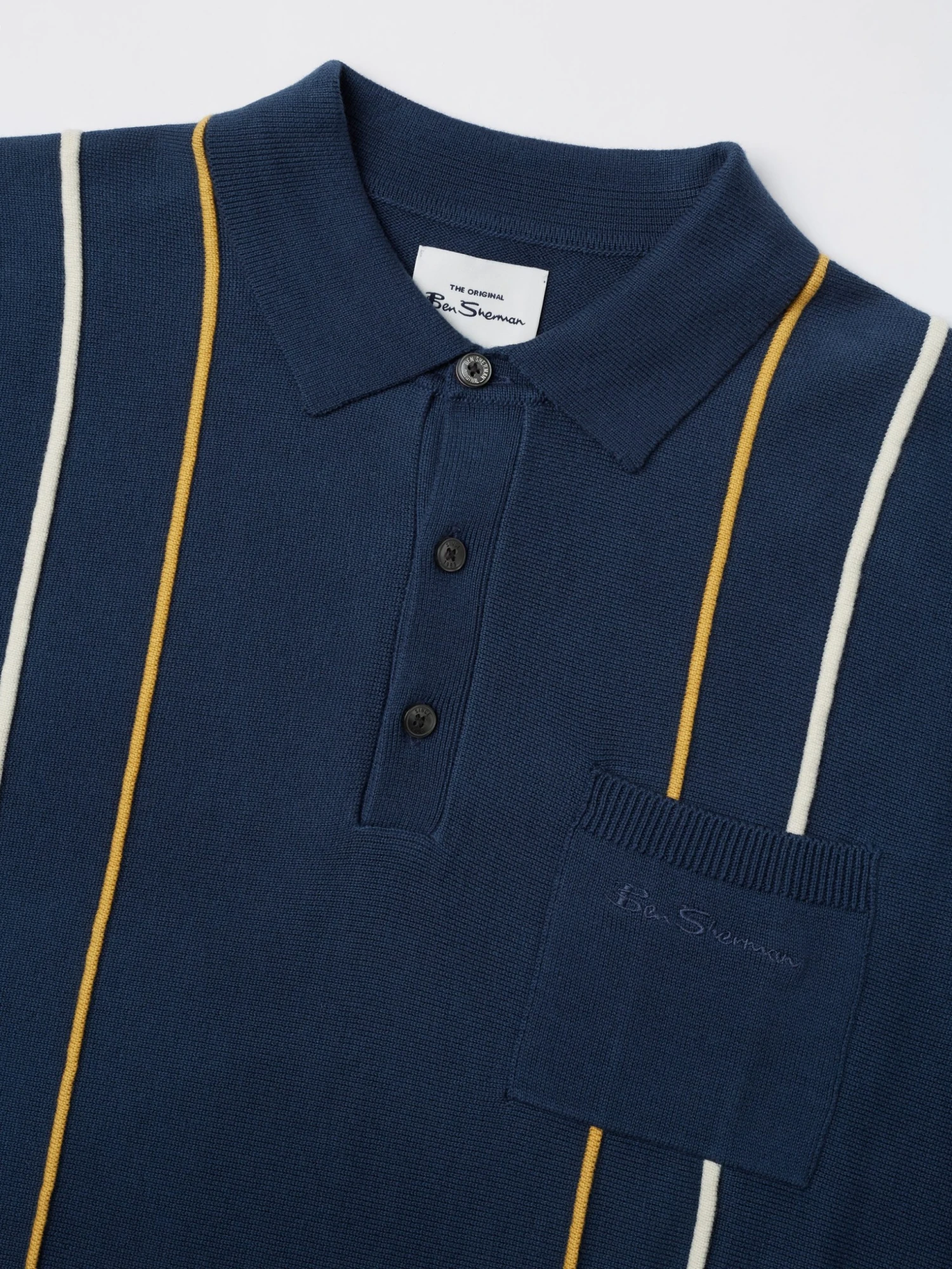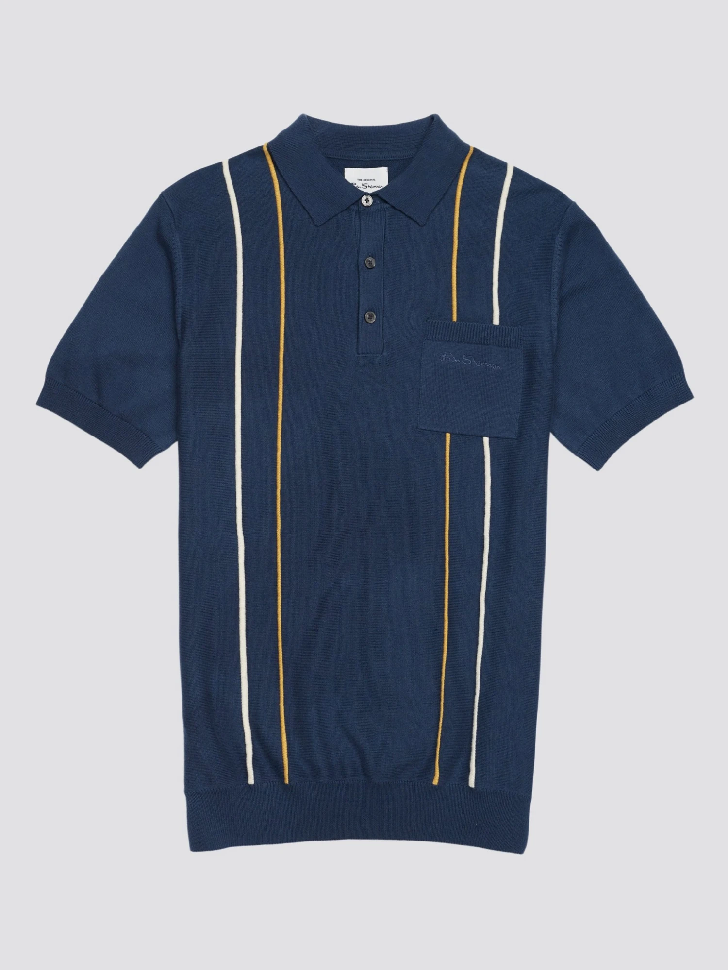 A short sleeve knitted polo in a regular fit designed with a minimal vertical stripe down the front. Features a patch pocket to the chest and raised texture for added interest. Branded with a tonal signature “Ben Sherman” chest embroidery.