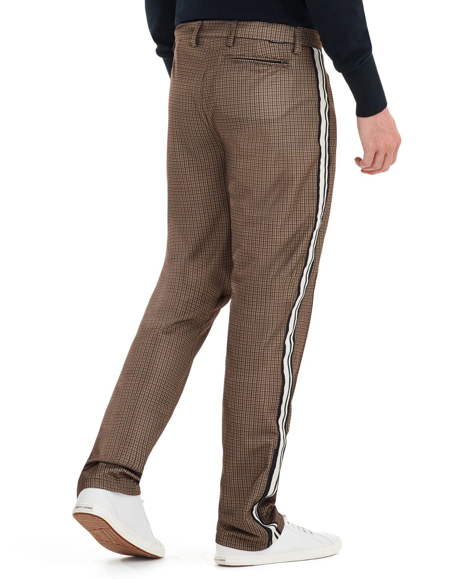As seen on the catwalk at London Fashion Week, these track pants are given a fashion-forward update in a printed dog tooth. The side stripes and bottom zips add to the sporty feel while pockets and belt loops give the pants a trouser look.