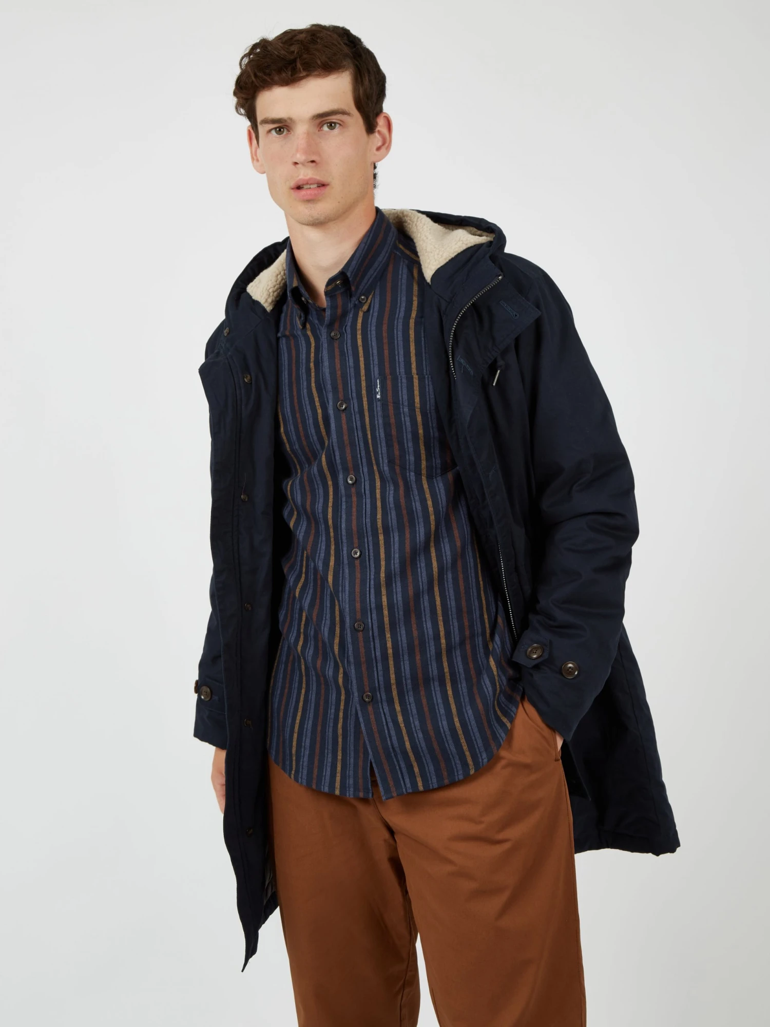This classic brushed mod stripe shirt from Ben Sherman comes in a regular fit with short sleeves and features a 3 finger button down collar. Made from 84% cotton, 16% viscose.