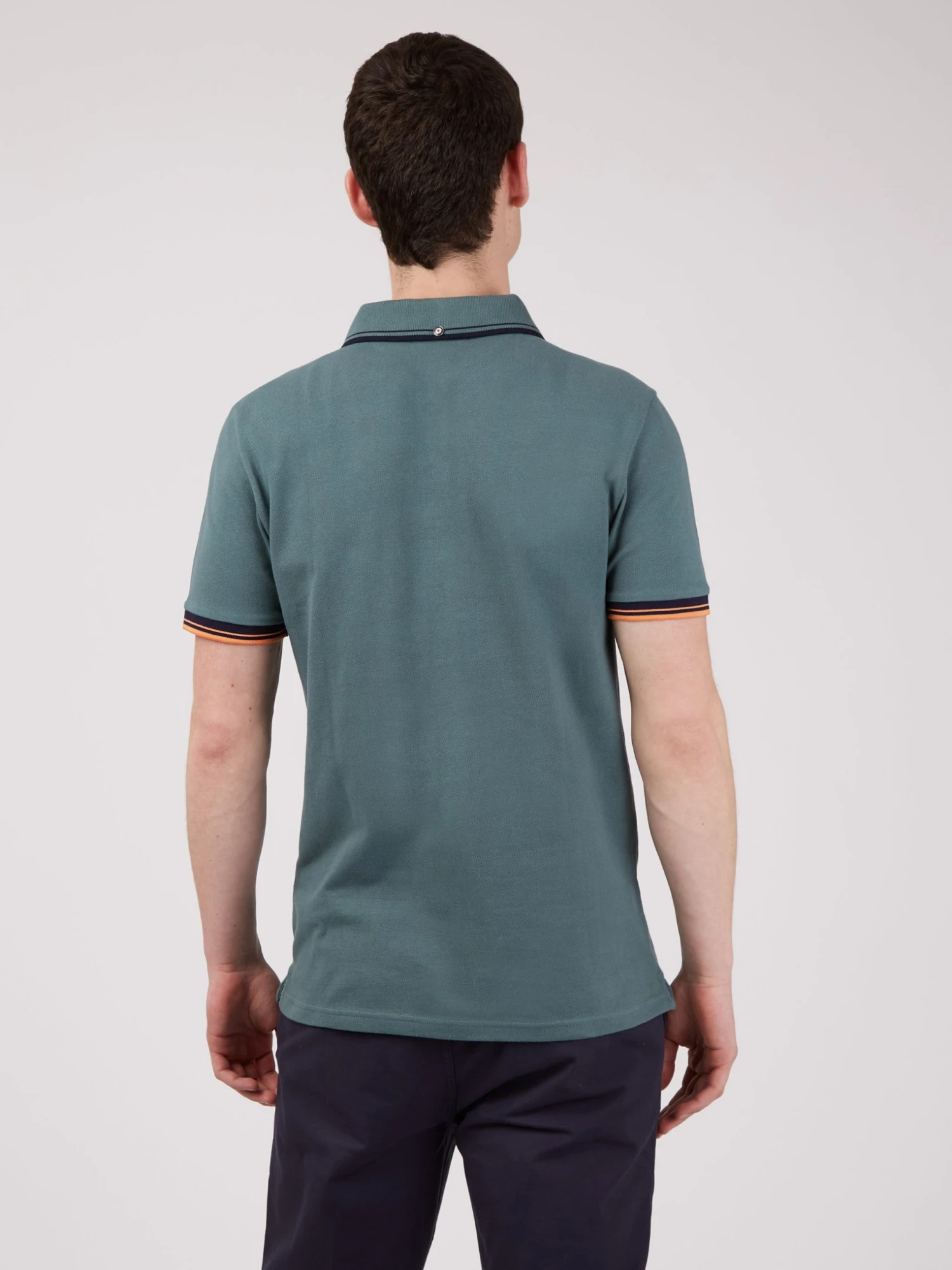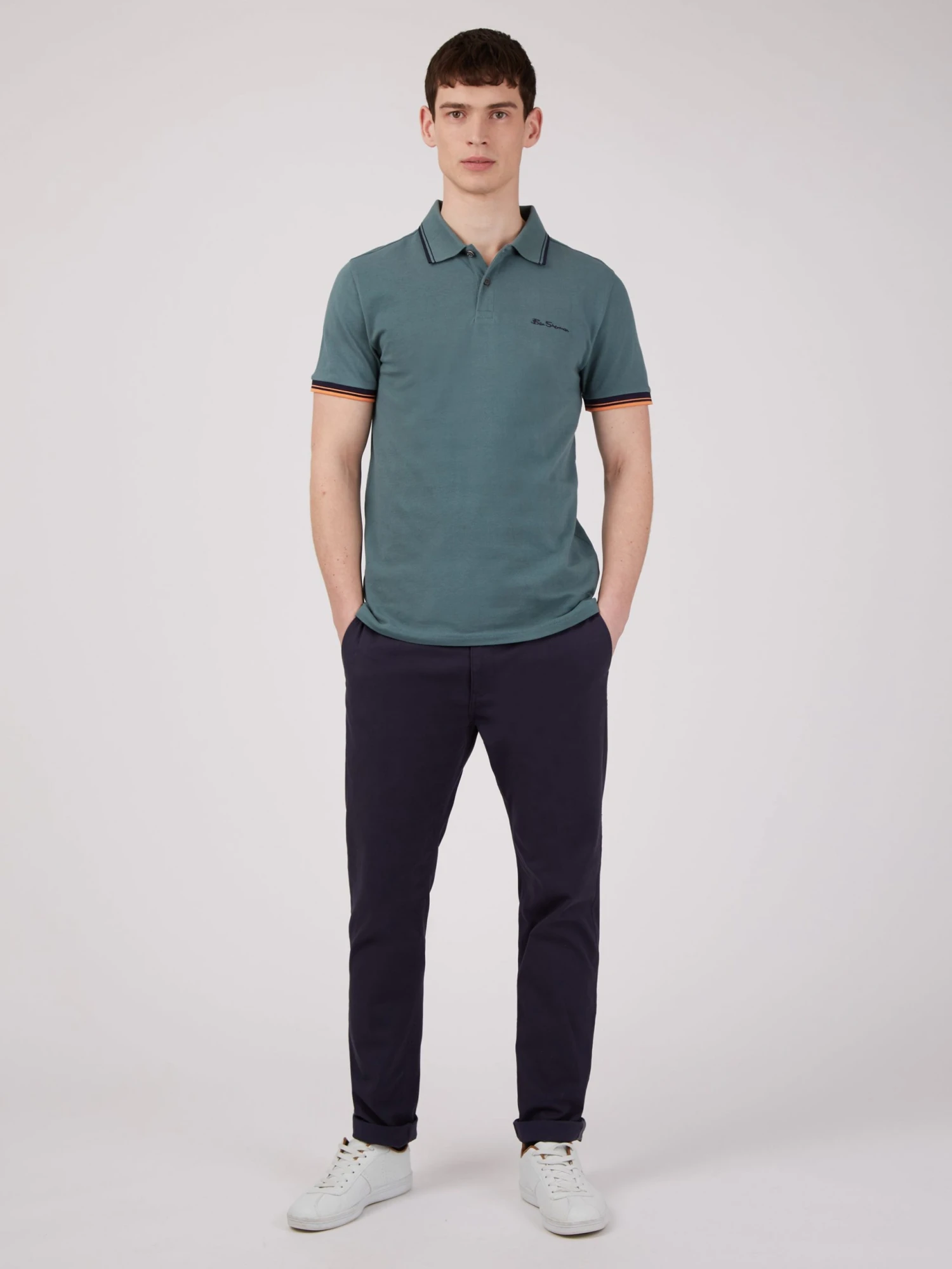 Our signature polo is a classic men’s cotton polo with contrast tipped detailing on the collar and cuffs. The polo is made with organic cotton and features a two-button fastening and a flat knit collar.