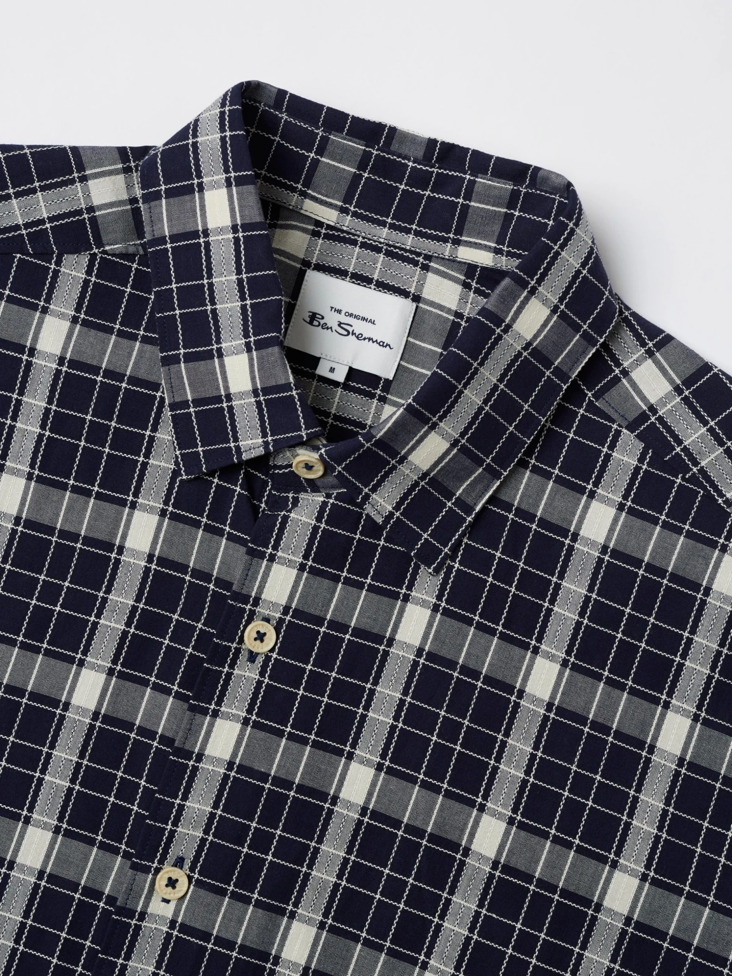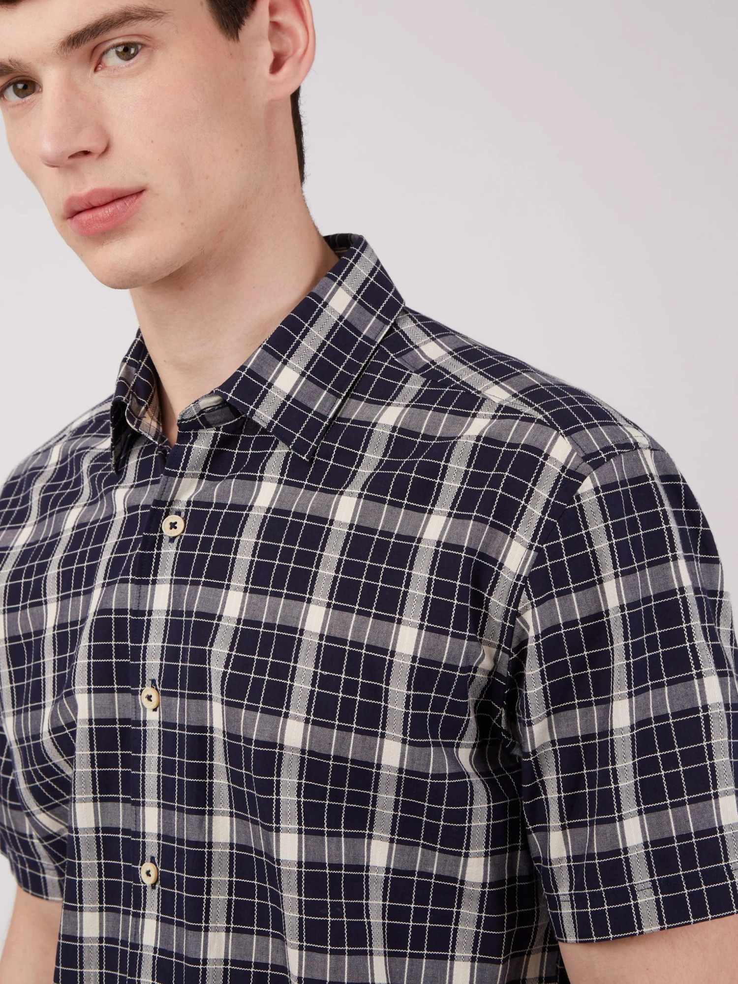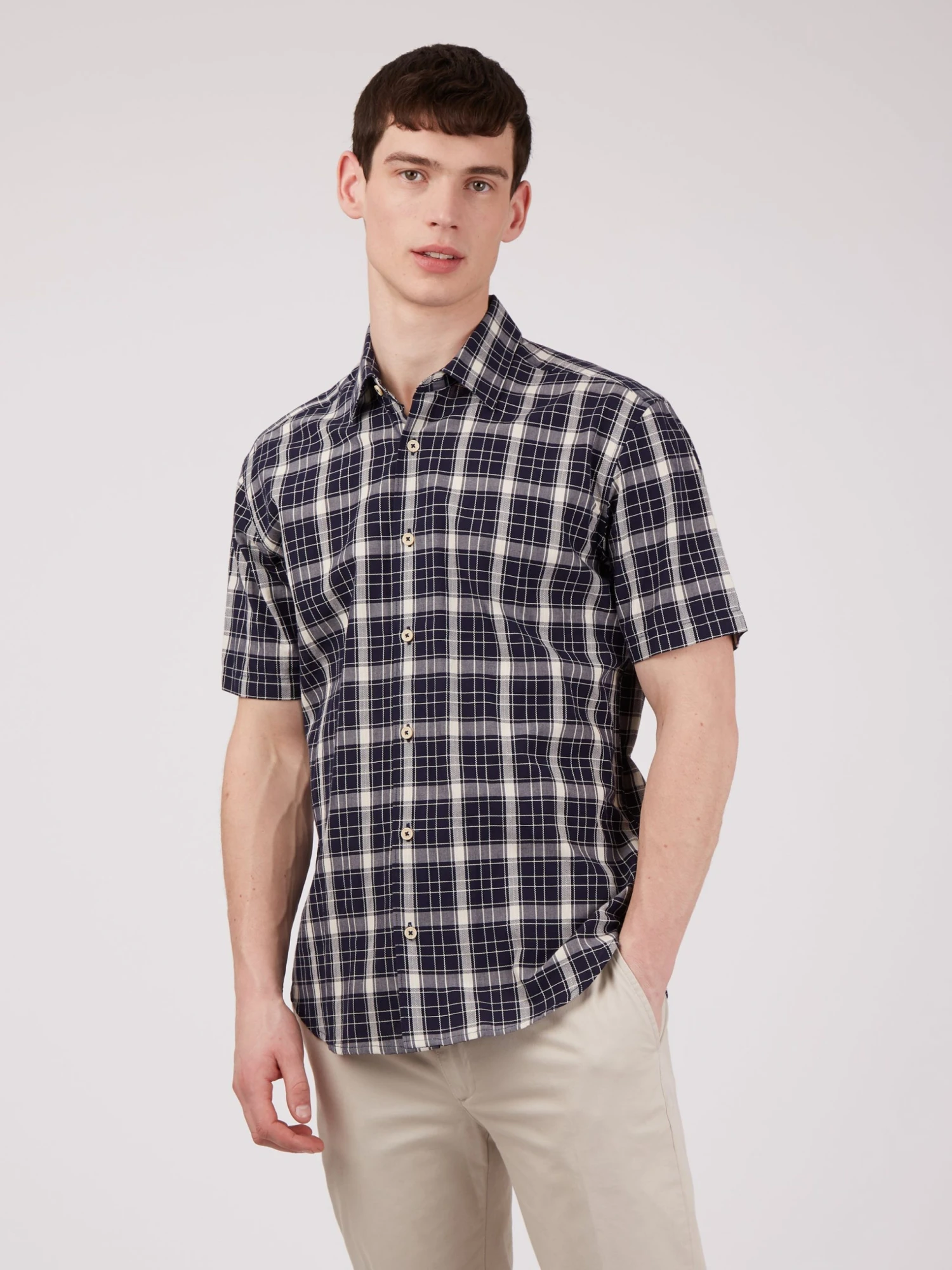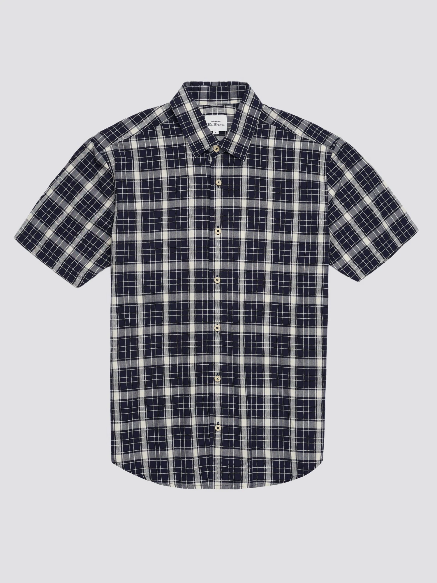 A short sleeve summer shirt in 100% cotton and a textured check design. Features include a casual point collar and longer sleeve length. This shirt comes in a relaxed fit, perfect for the summer season. Branded with the Ben Sherman woven side tab.