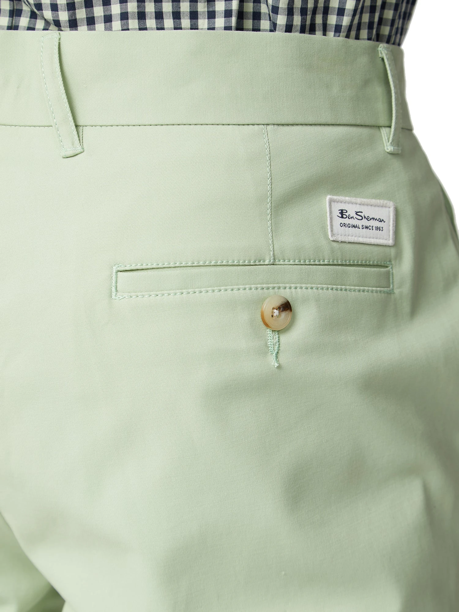 Our signature slim-fit chino short is made from stretch-fit cotton for comfortable everyday style. The shorts feature two side pockets with a coin pocket, two jet pockets with Ben Sherman branding on the center back, and mod stripe tape detailing on the turn-up hem.