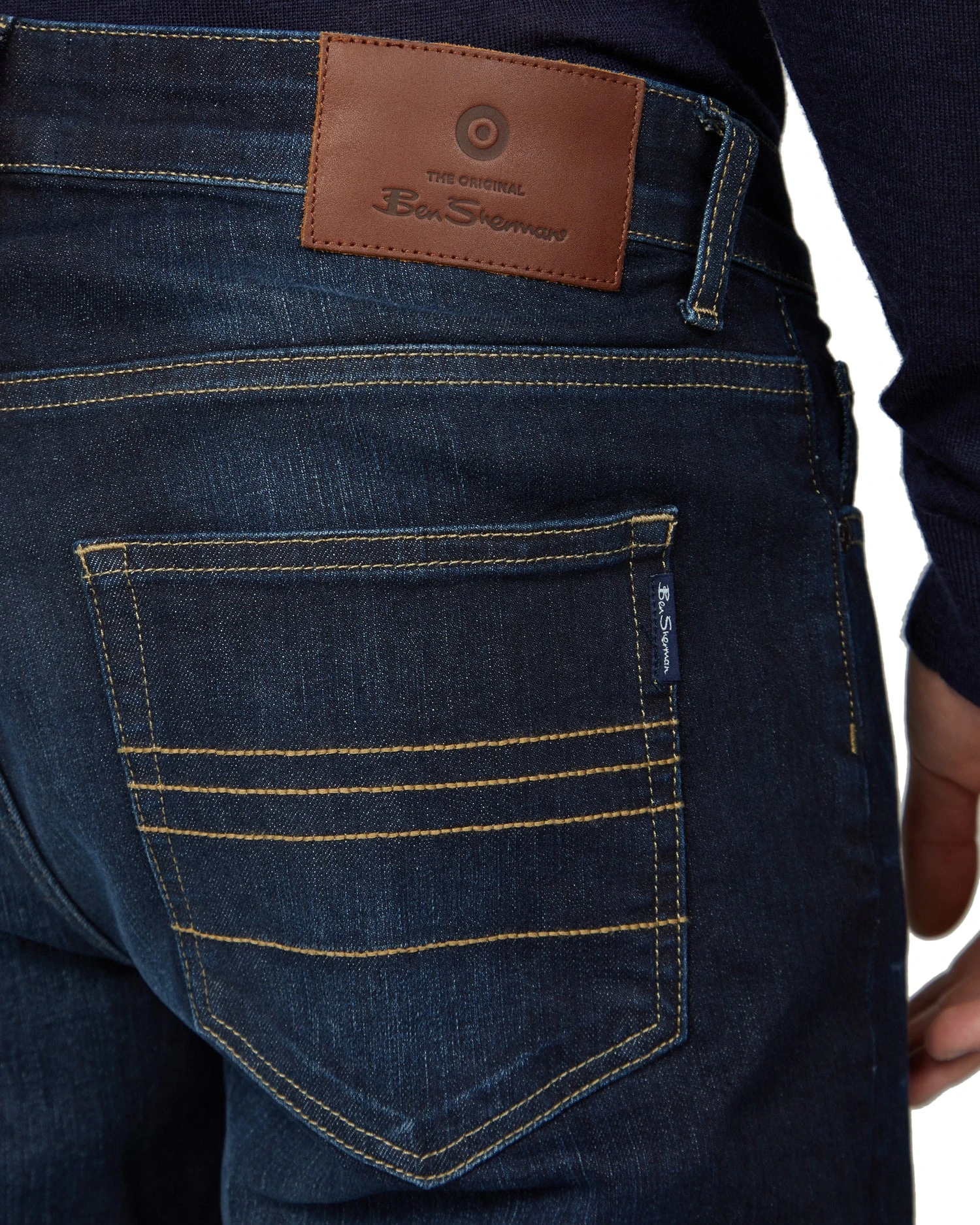 Perfect for everyday, these slim taper jeans are a versatile vintage wash and feature two side pockets with a coin pocket, two patch pockets with a Ben Sherman branded woven label on the center back, and a Ben Sherman branded leather patch on the waistband.