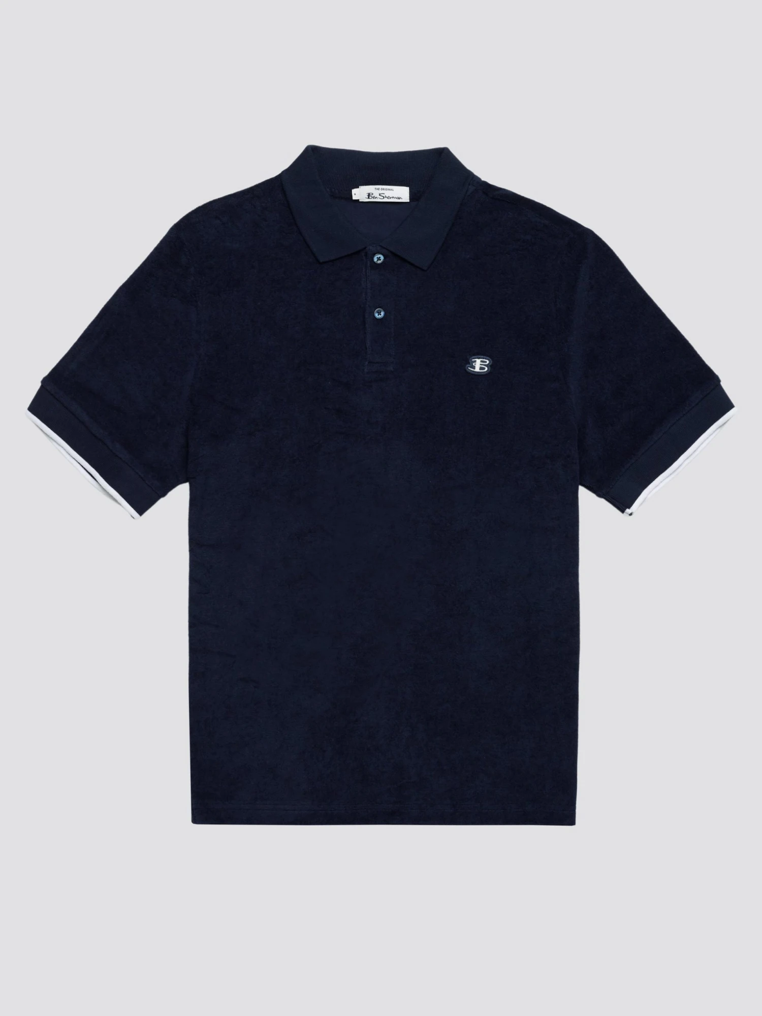 Textured toweling polo with contrast tipping at cuff. Designed with a hidden button placket for a clean finish and branded with a “B” embroidered badge.