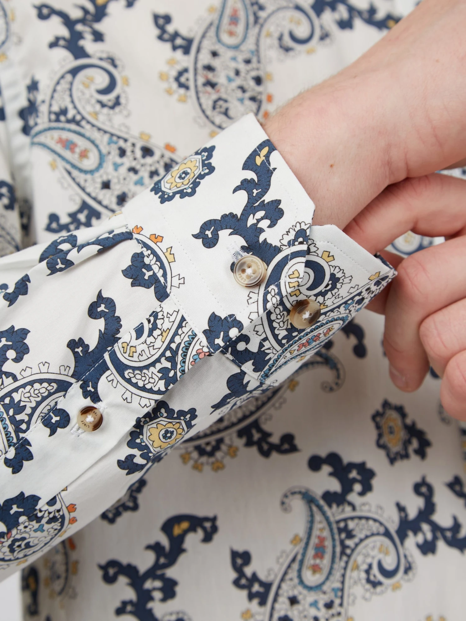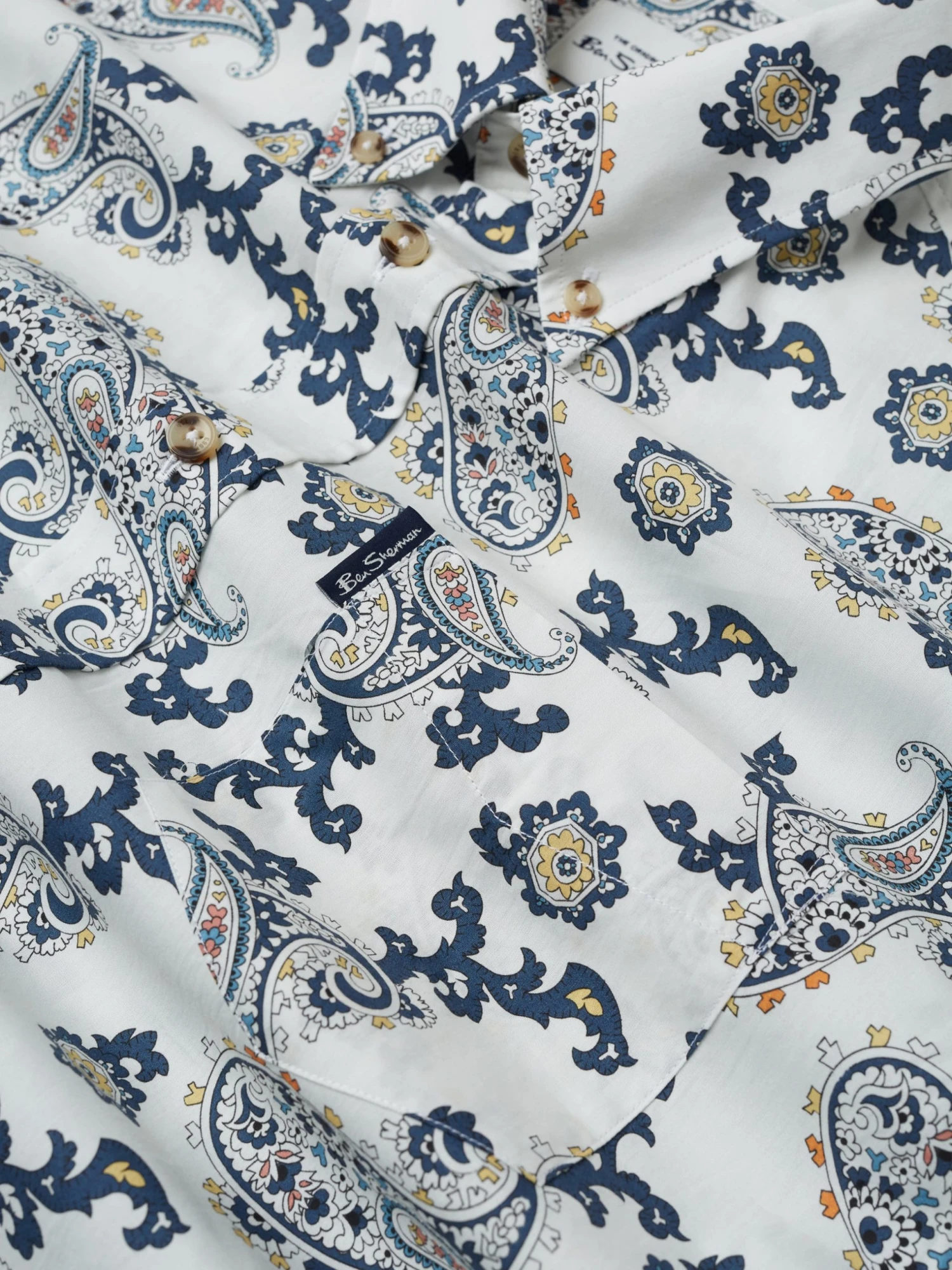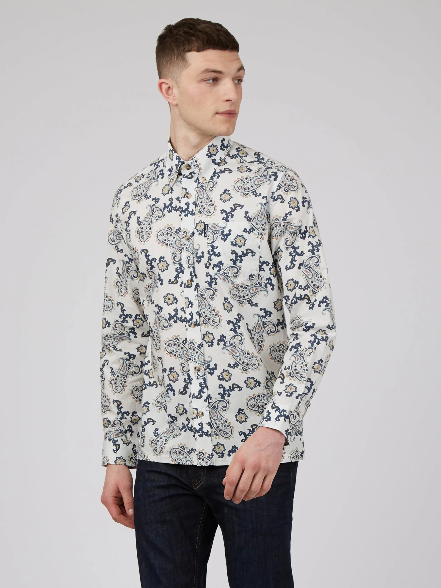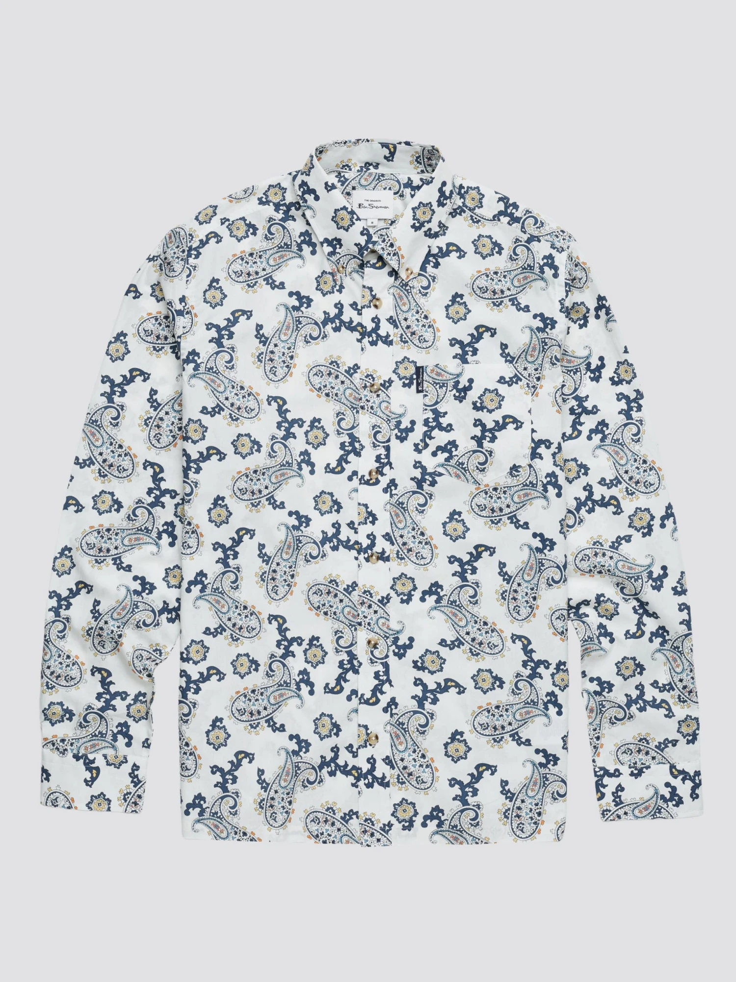 A long sleeve shirt designed in a large paisley print that comes in a regular fit and features a 3 finger button down collar. Complete with a patch pocket at the chest and branded with the Ben Sherman woven pocket tab. Made from 100% cotton.