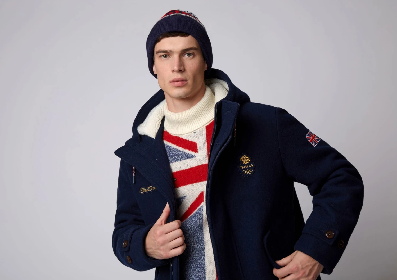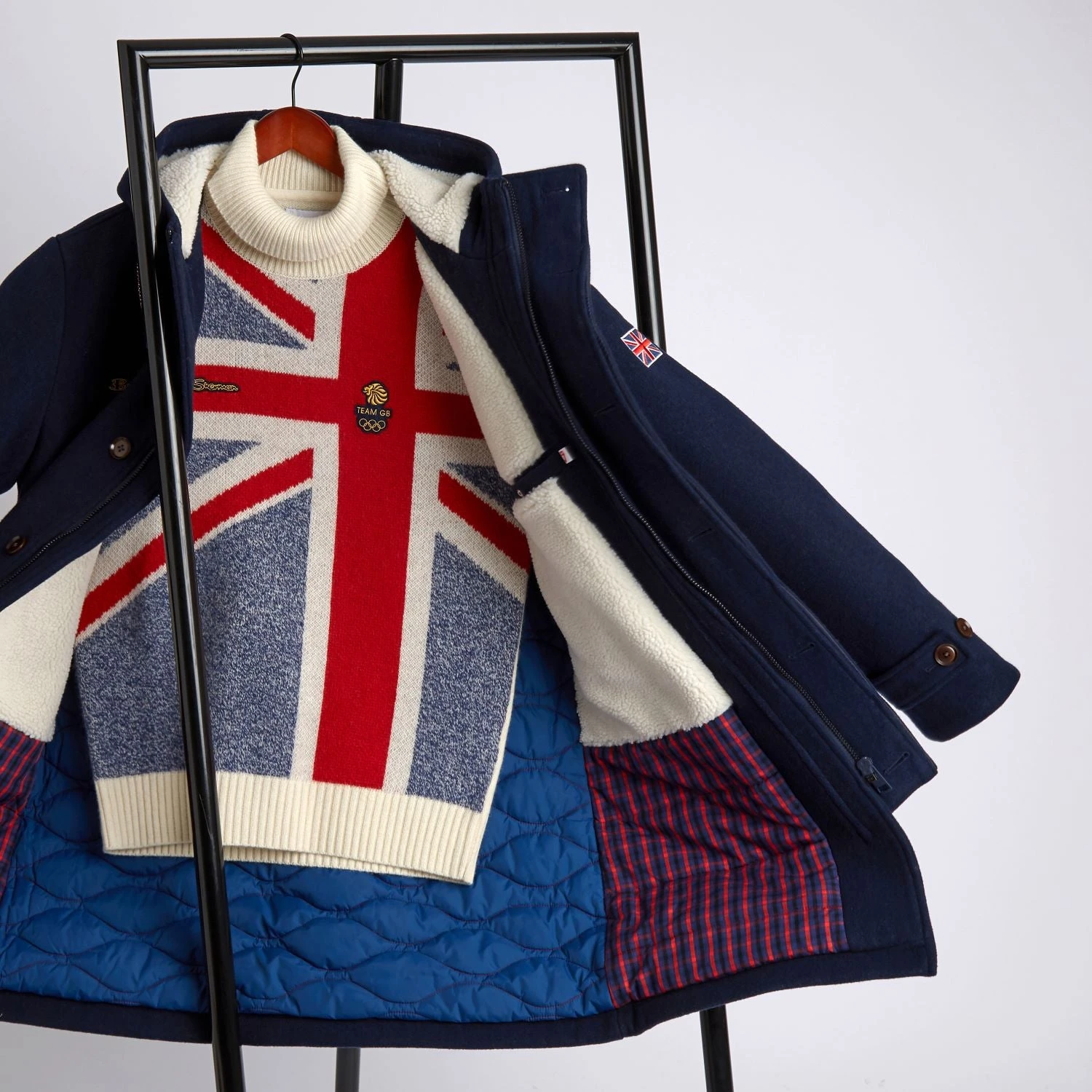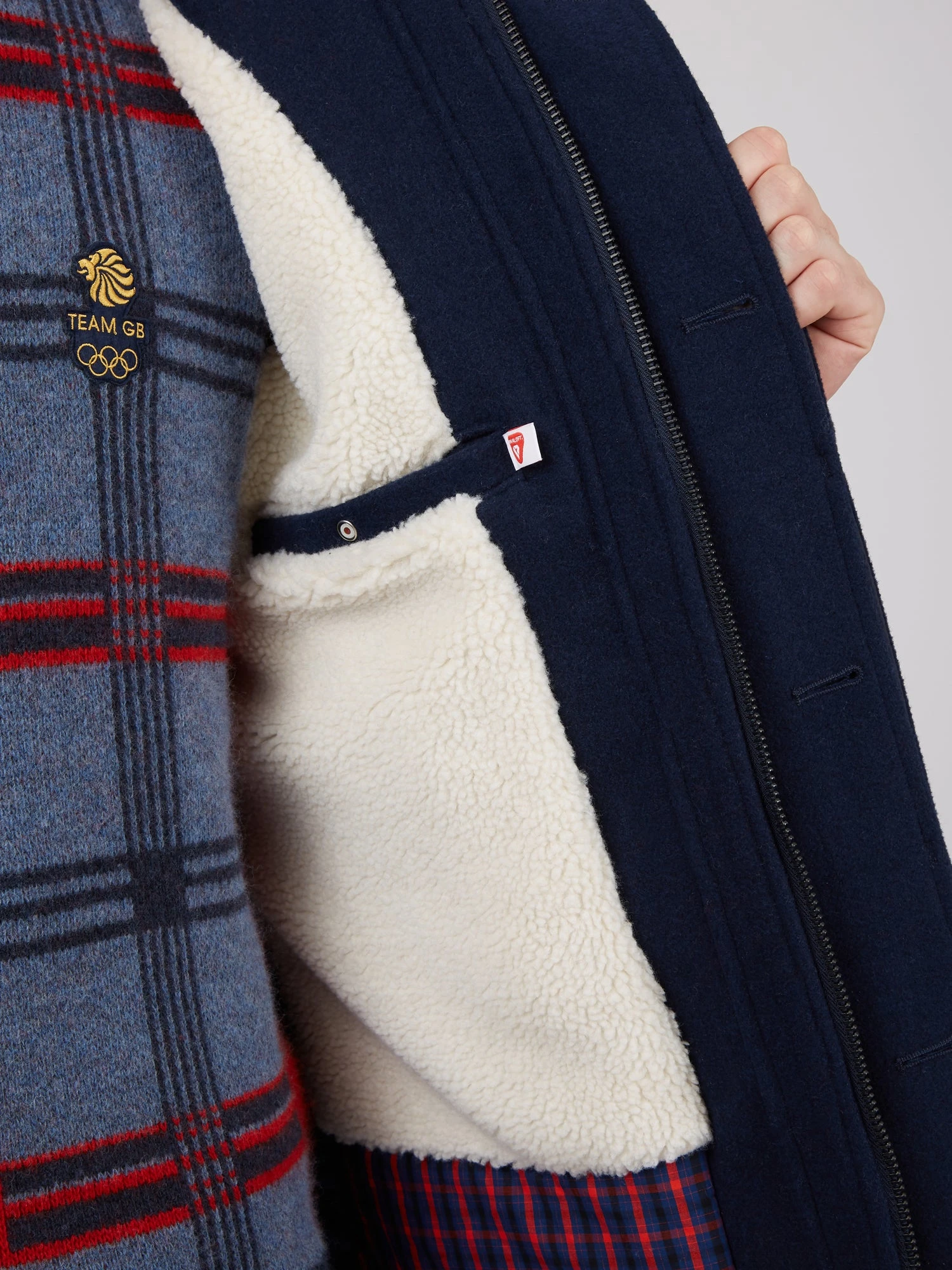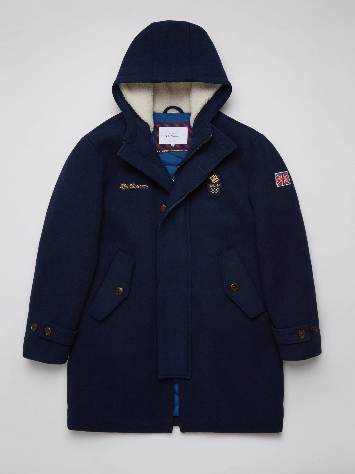 A wool blend parka created in partnership with the Team GB Beijing Olympics. This specially made parka features Team GB design quilted lining and a borg lined hood with borg lined internal panels. Features also include an adjustable hood and cuffs. Features Olympic branded embroidered badges to the chest and branded with specially developed Olympic labels in 100% recycled polyester.