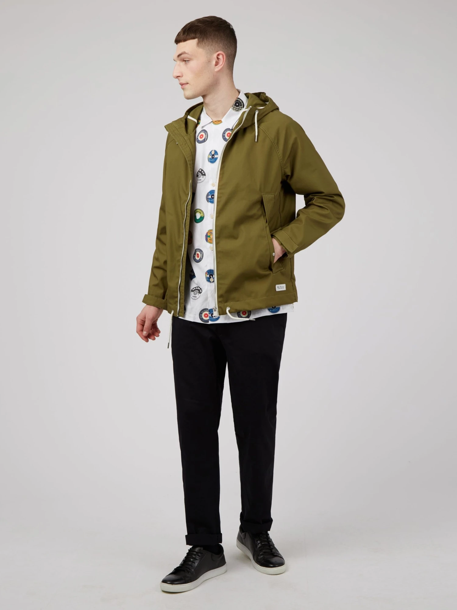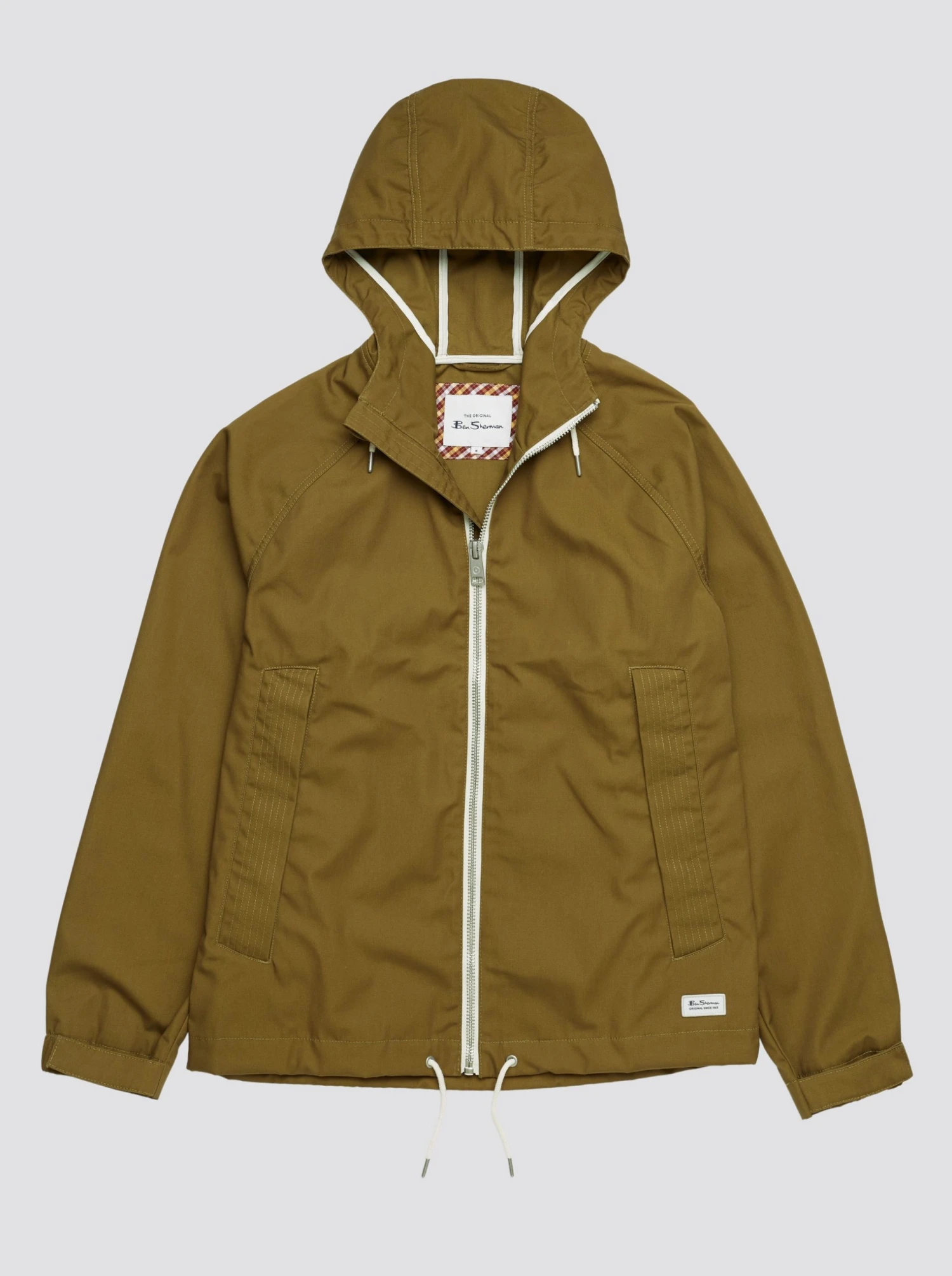 A hooded rainwear jacket in a shower resistant fabric. Features include a drawcord at the hood and hem, large reverse welt pockets with multi-stitch detailing, elasticated cuffs with an adjuster tab and a Ben Sherman branded woven badge at the hem.