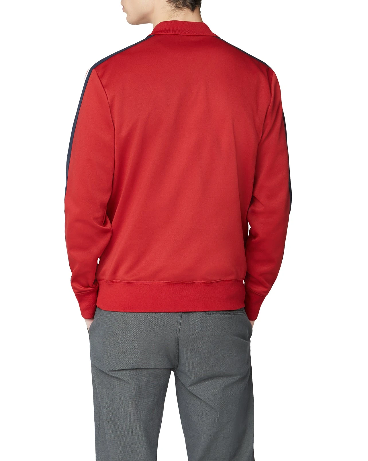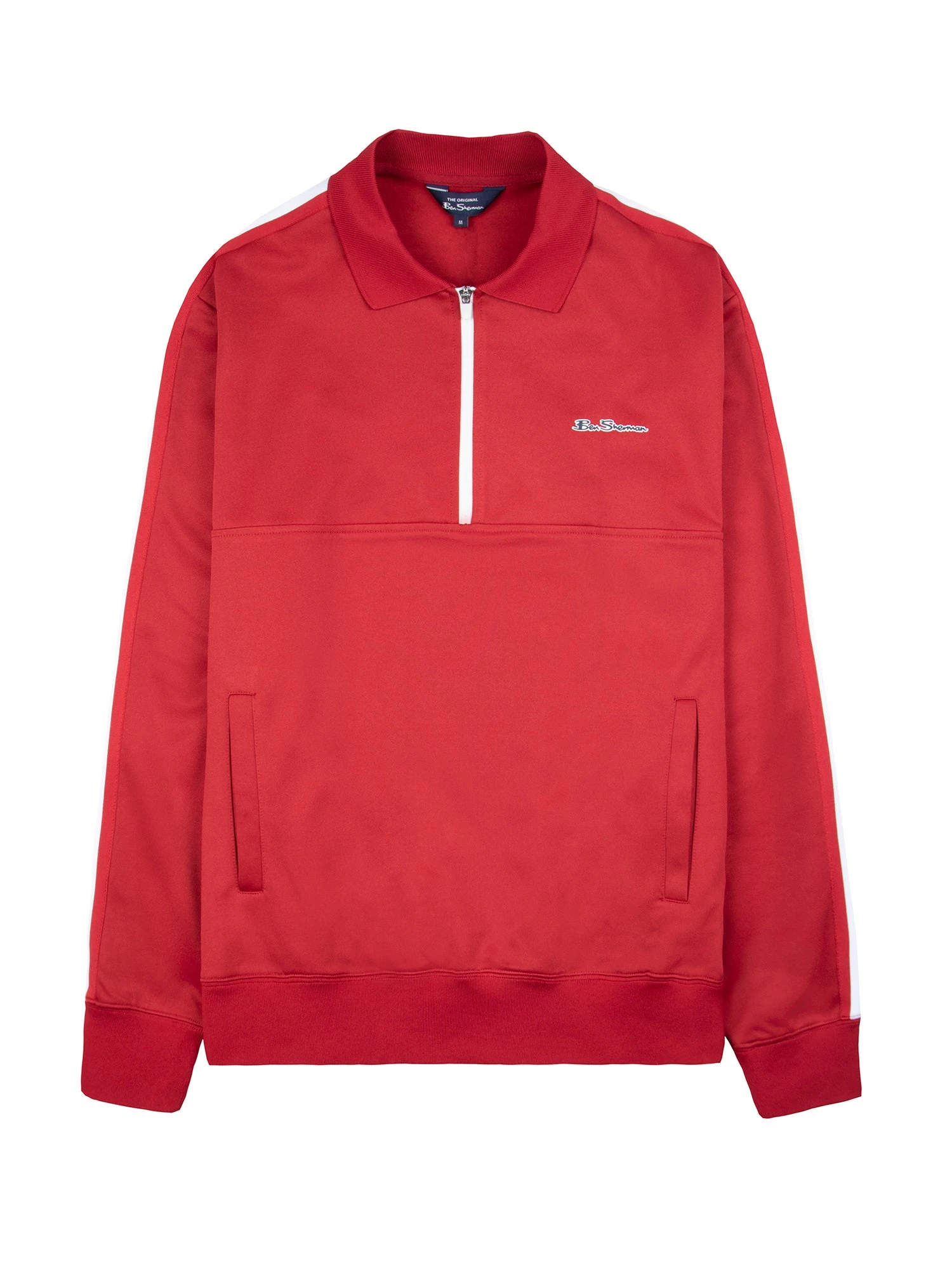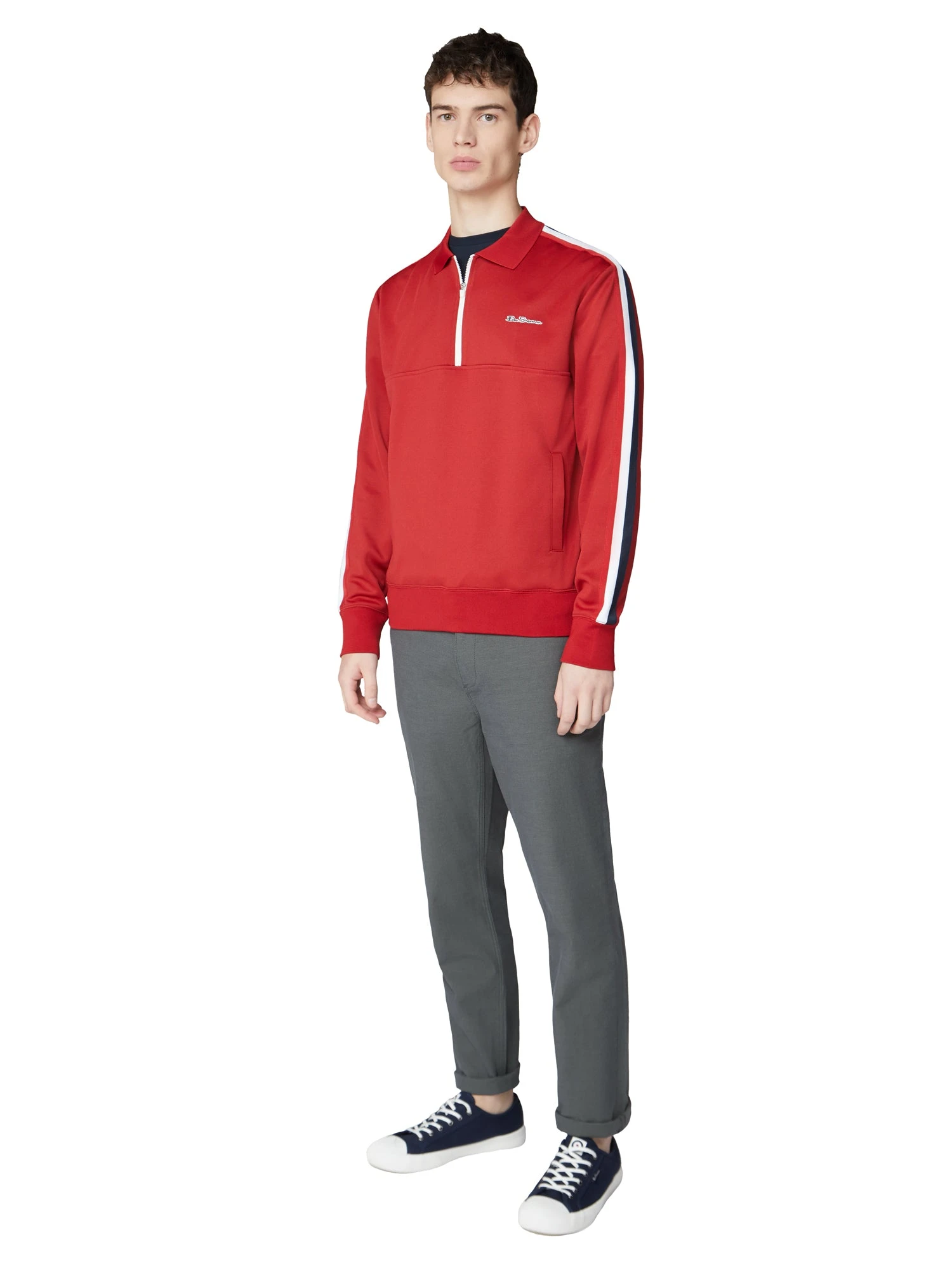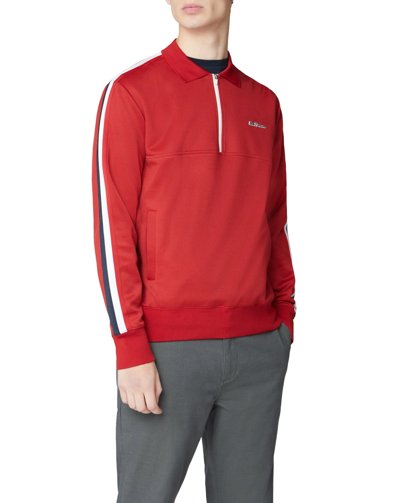 This tricot pullover has a quarter-zip neck and collar and features striped tape-down sleeves and a silicone “Ben Sherman” badge on the left chest.