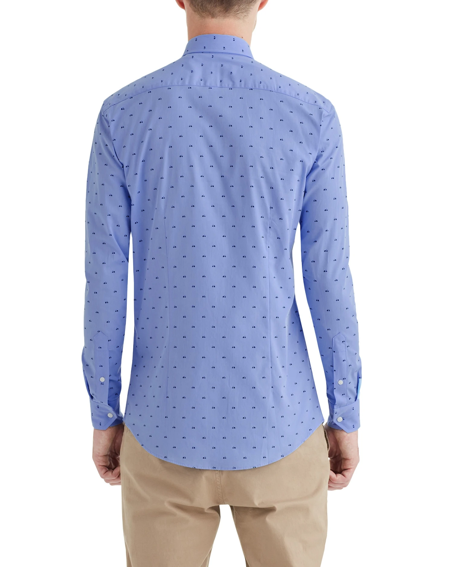The Blue Scooter Print Skinny-Fit Dress Shirt combines a modern, skinny fit with a scooter pattern that will set you apart from the crowd.