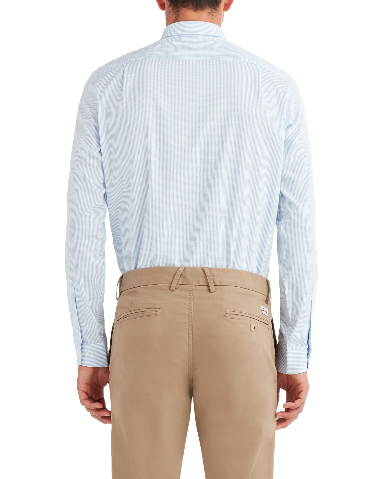 The Light Blue Dobby Stripe Dress Shirt is cut to a slim fit in 100% cotton with dobby texture. The stripe pattern gives an instant wardrobe update.