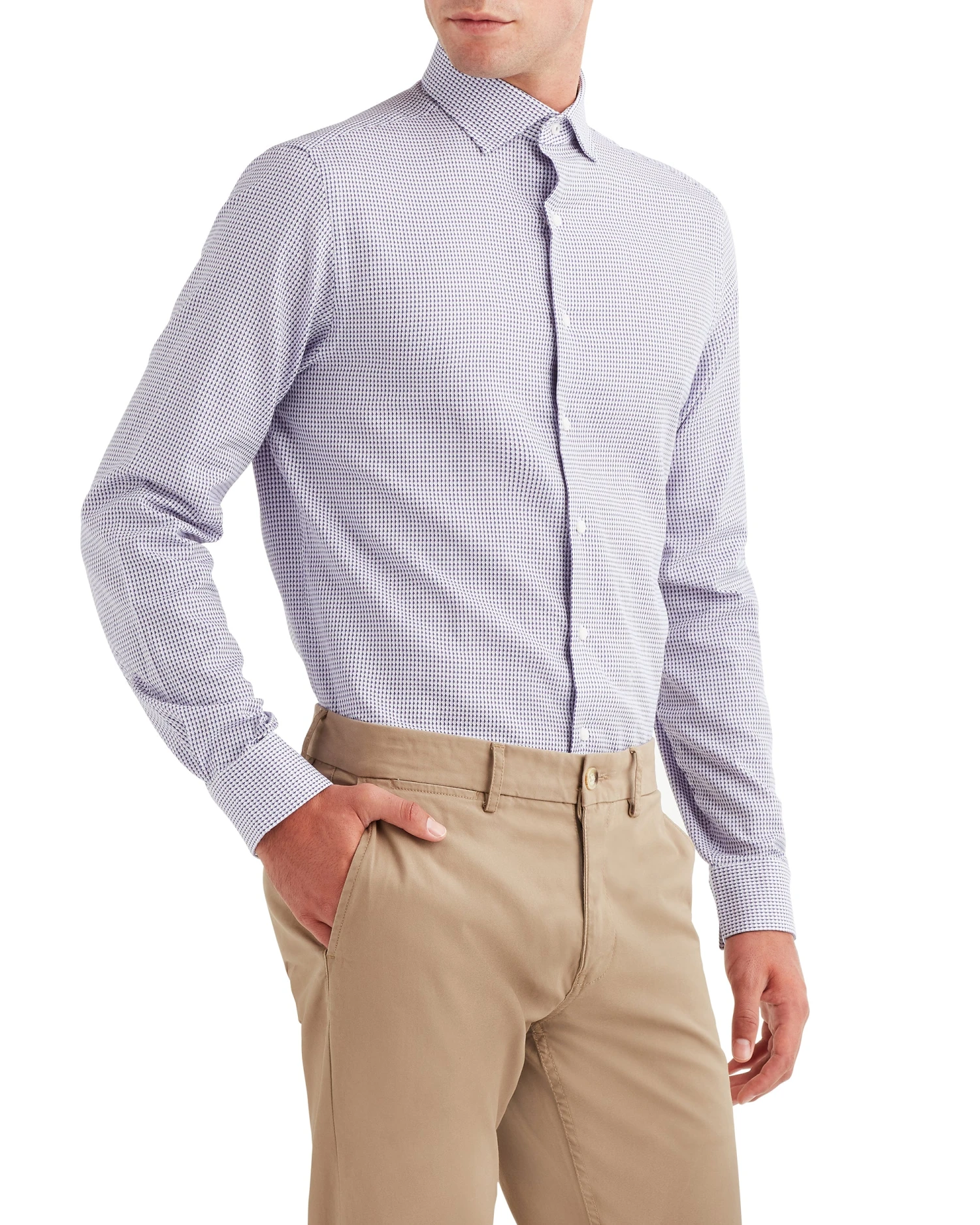 The Purple Multi Dobby Tooth Dress Shirt is cut to a slim fit in 100% cotton with dobby texture. The pattern gives an instant wardrobe update.