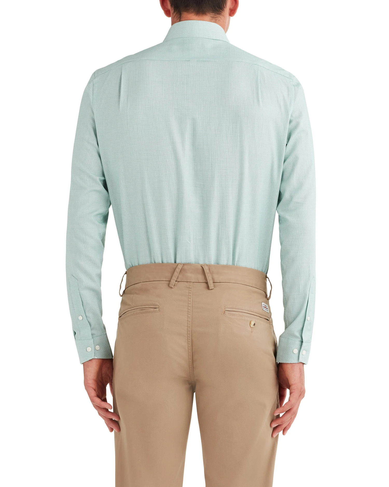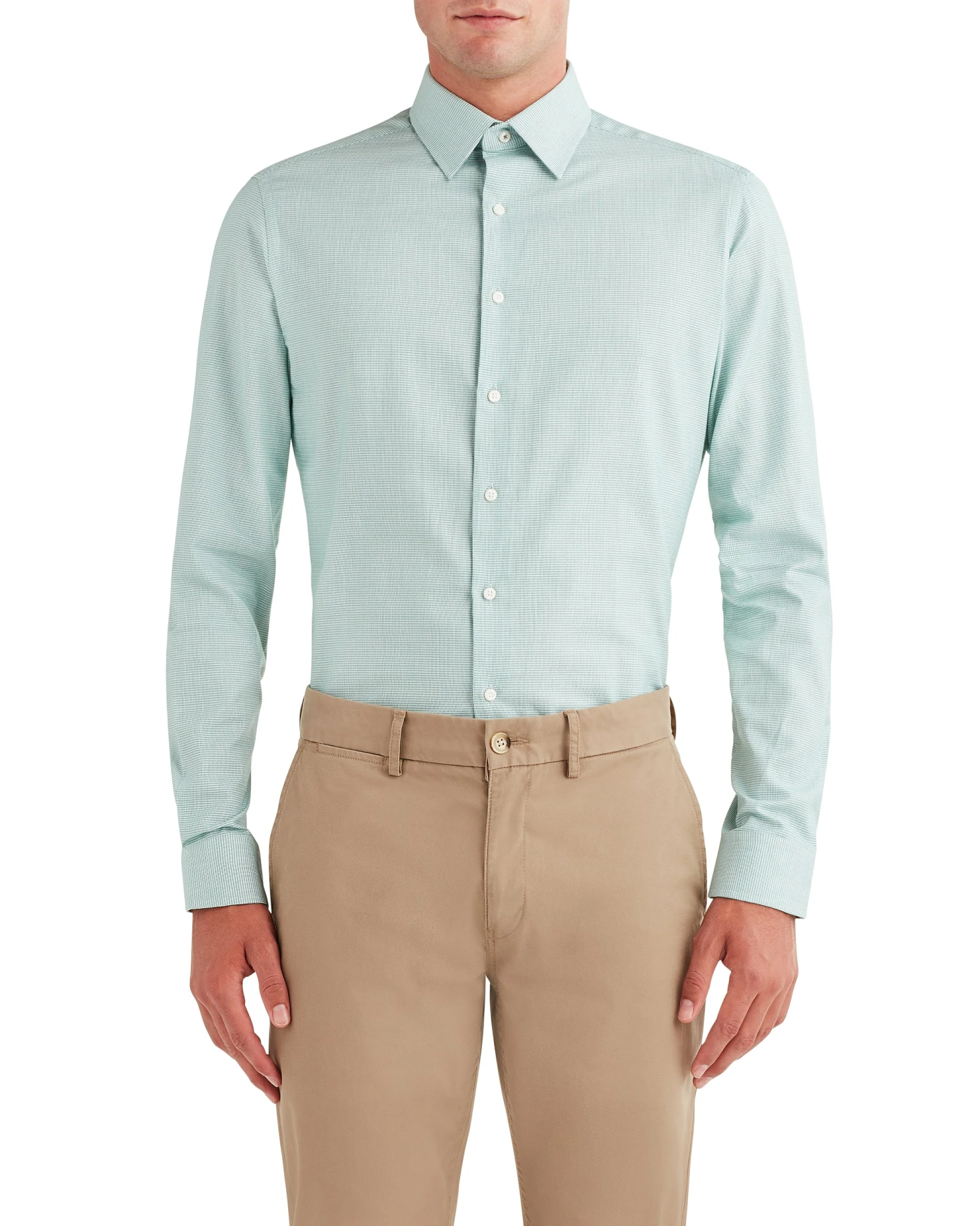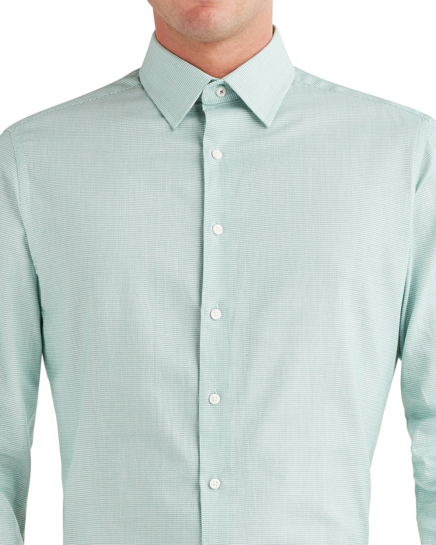 The Green & White Unsolid Dress Shirt is cut to a slim fit in 100% cotton with dobby texturing. The style appears solid upon first glance but is actually made up a mini woven-like pattern of green and white.