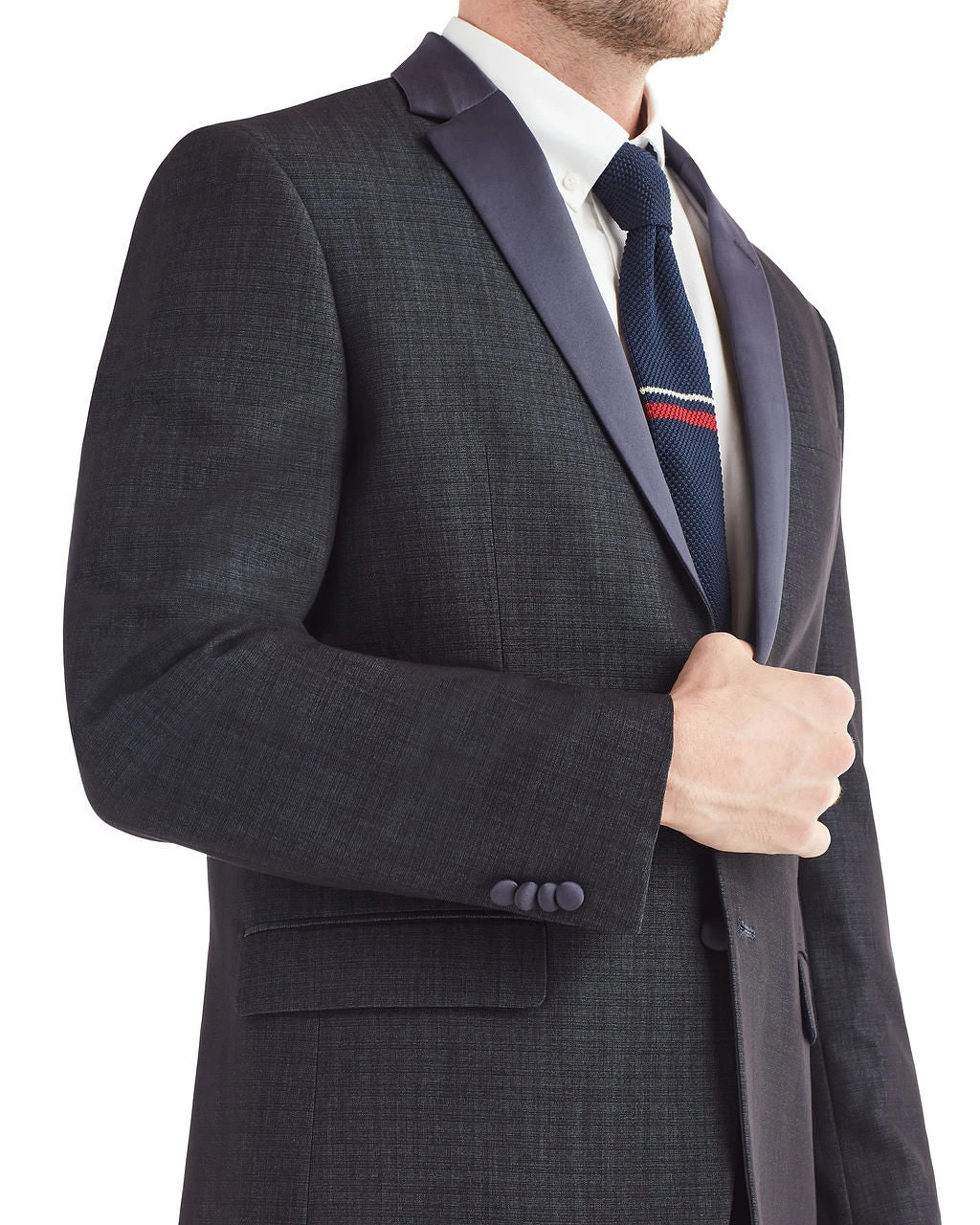 The Cedar two-piece tuxedo has a stylish contrast notch lapel and tuxedo stripe.