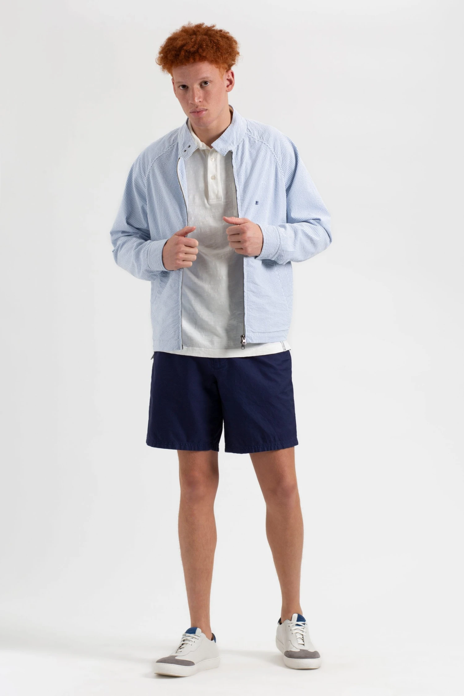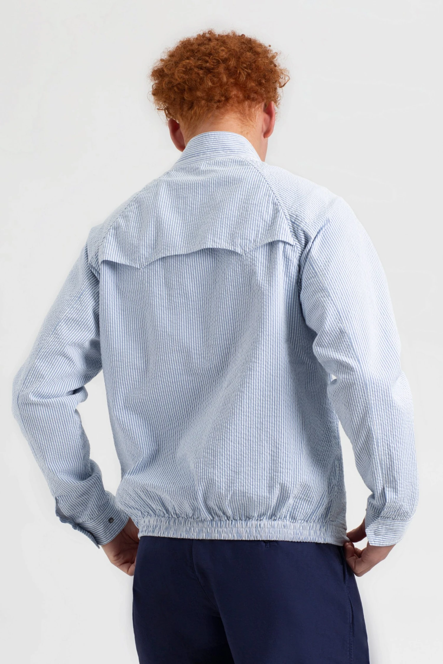 Our Seersucker Harrington is a summer interpretation of the Harrington jacket and nods to Ivy League ‘60s college styling. The seersucker cloth makes this Harrington jacket breathable in the hottest climates, and the style fits slim like our classic Harrington. We’ve finished the jacket with our signature B logo embroidered onto the left chest.