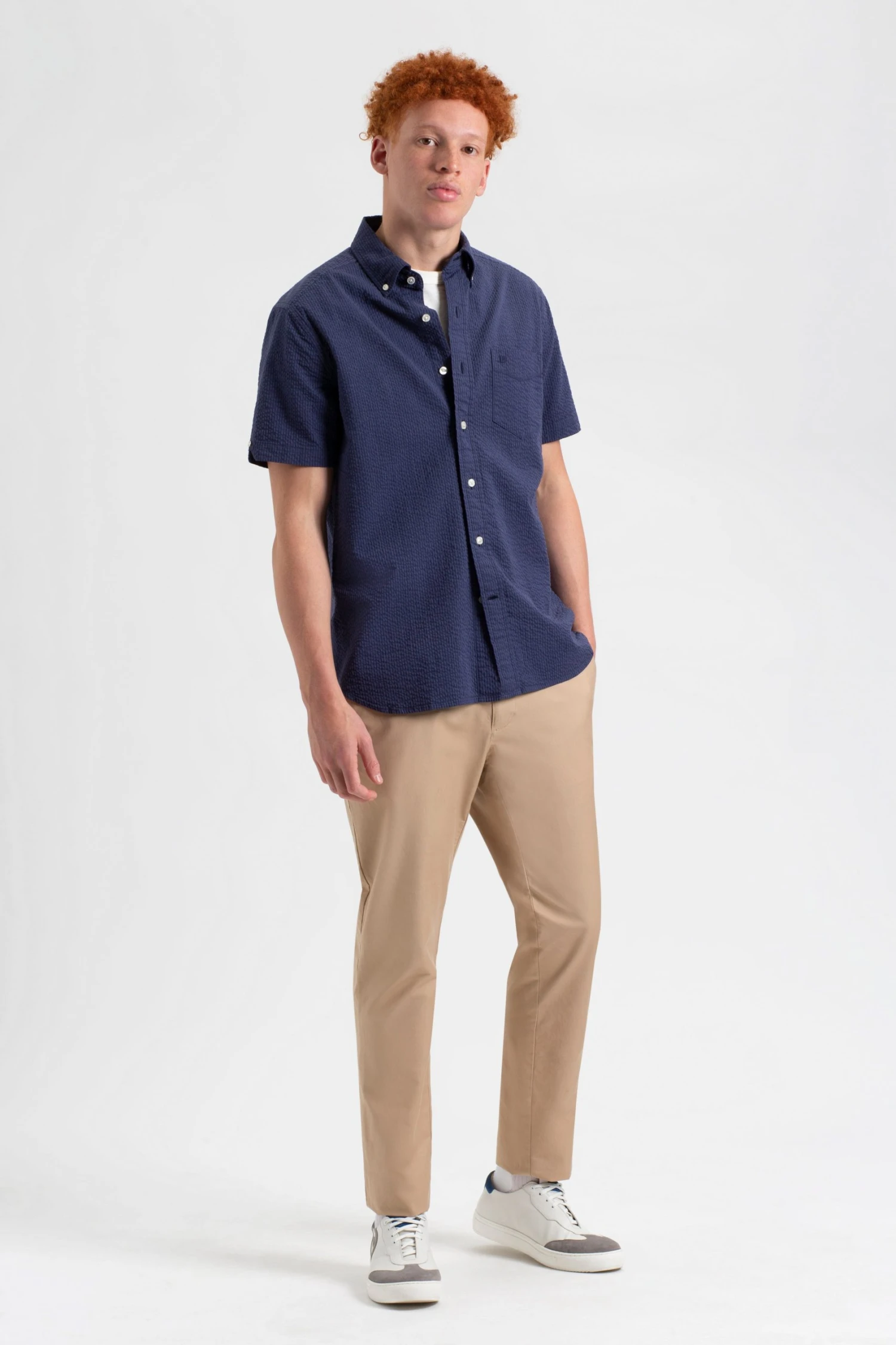 The Short Sleeve Seersucker Bengal Stripe Shirt is an iconic Ivy League classic. The shirt is cut from performance seersucker cloth, which allows for ultimate breathability due to the special weave of the material. The shirt comes in our best-selling Mod Fit with our signature B embroidered onto the left chest pocket. The perfect spring shirt.