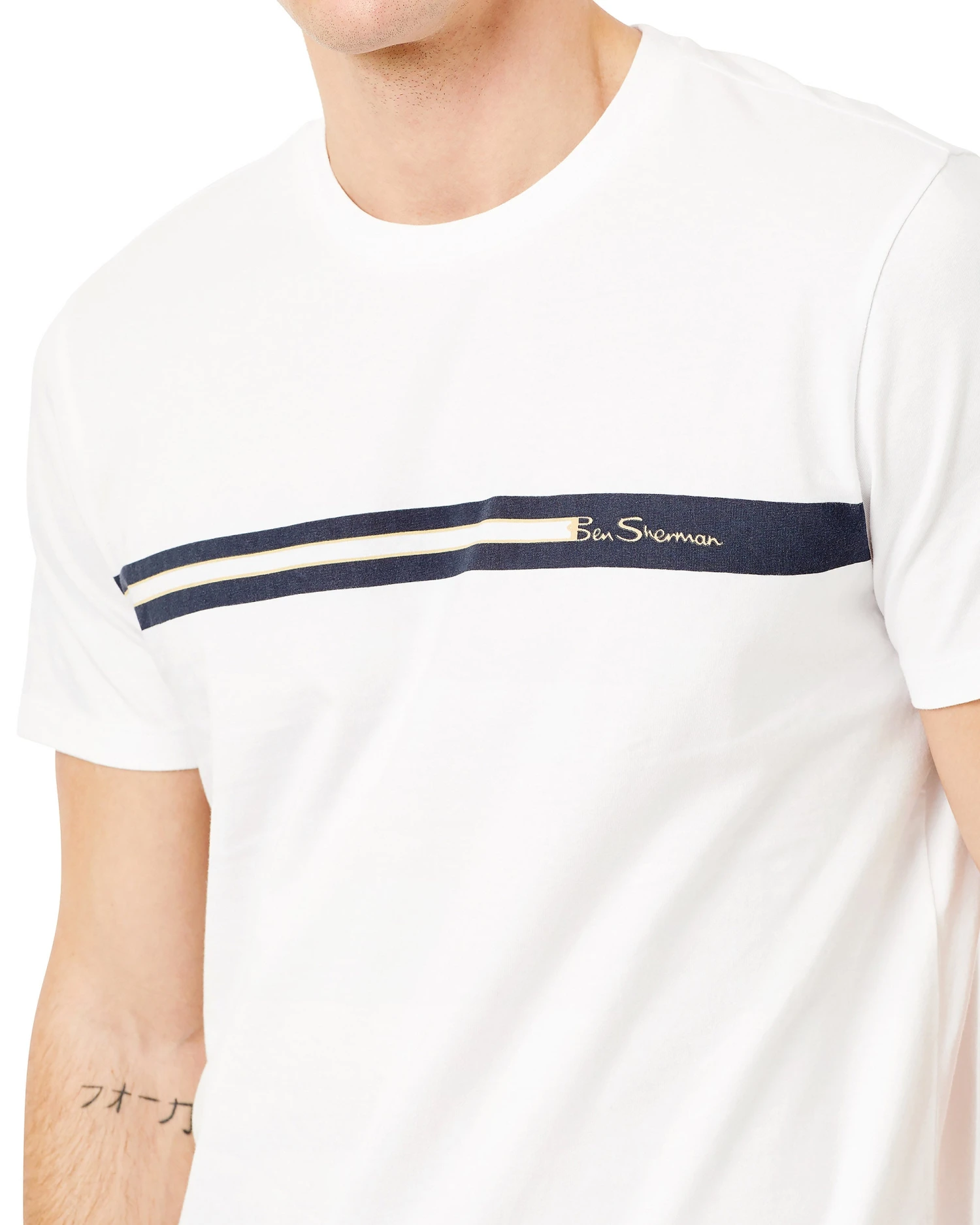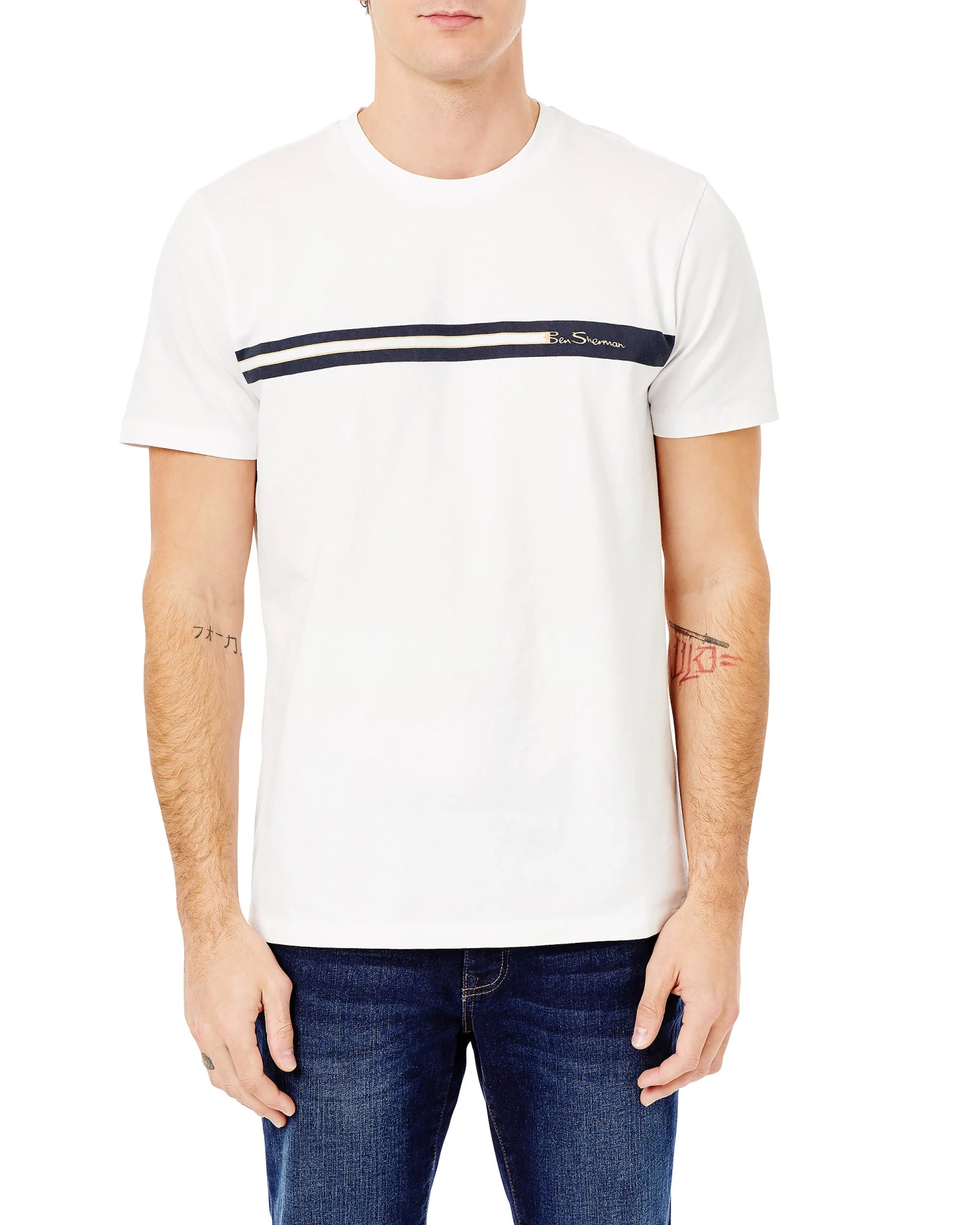This crewneck tee features a solid stripe across the front and the Ben Sherman logo on the chest.