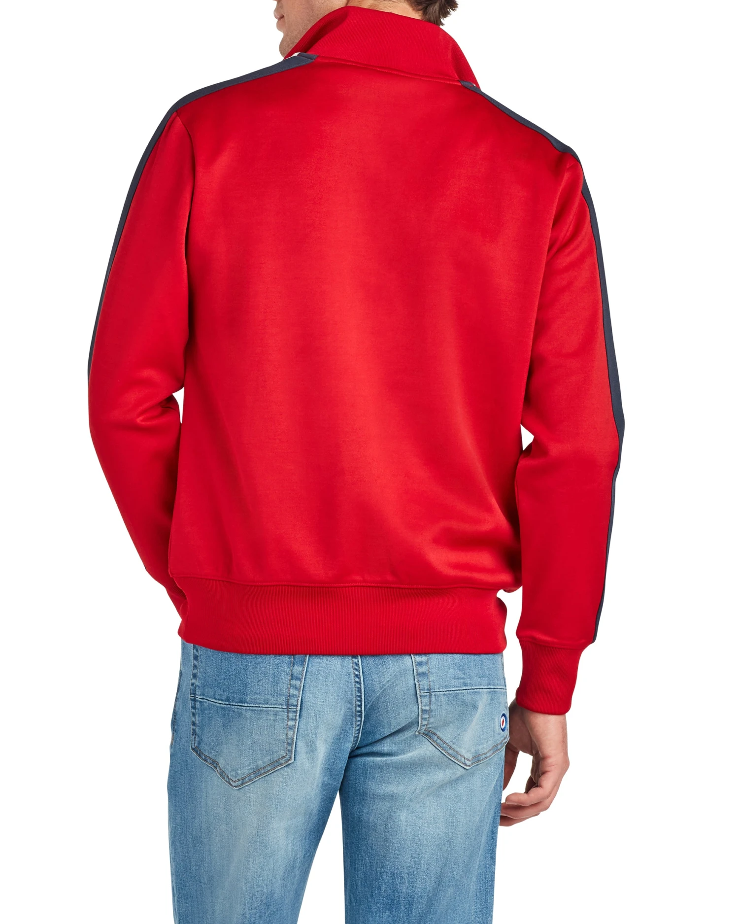This tricot pullover has a quarter-zip neck and collar and features striped tape-down sleeves and a silicone “Ben Sherman” badge on the left chest.