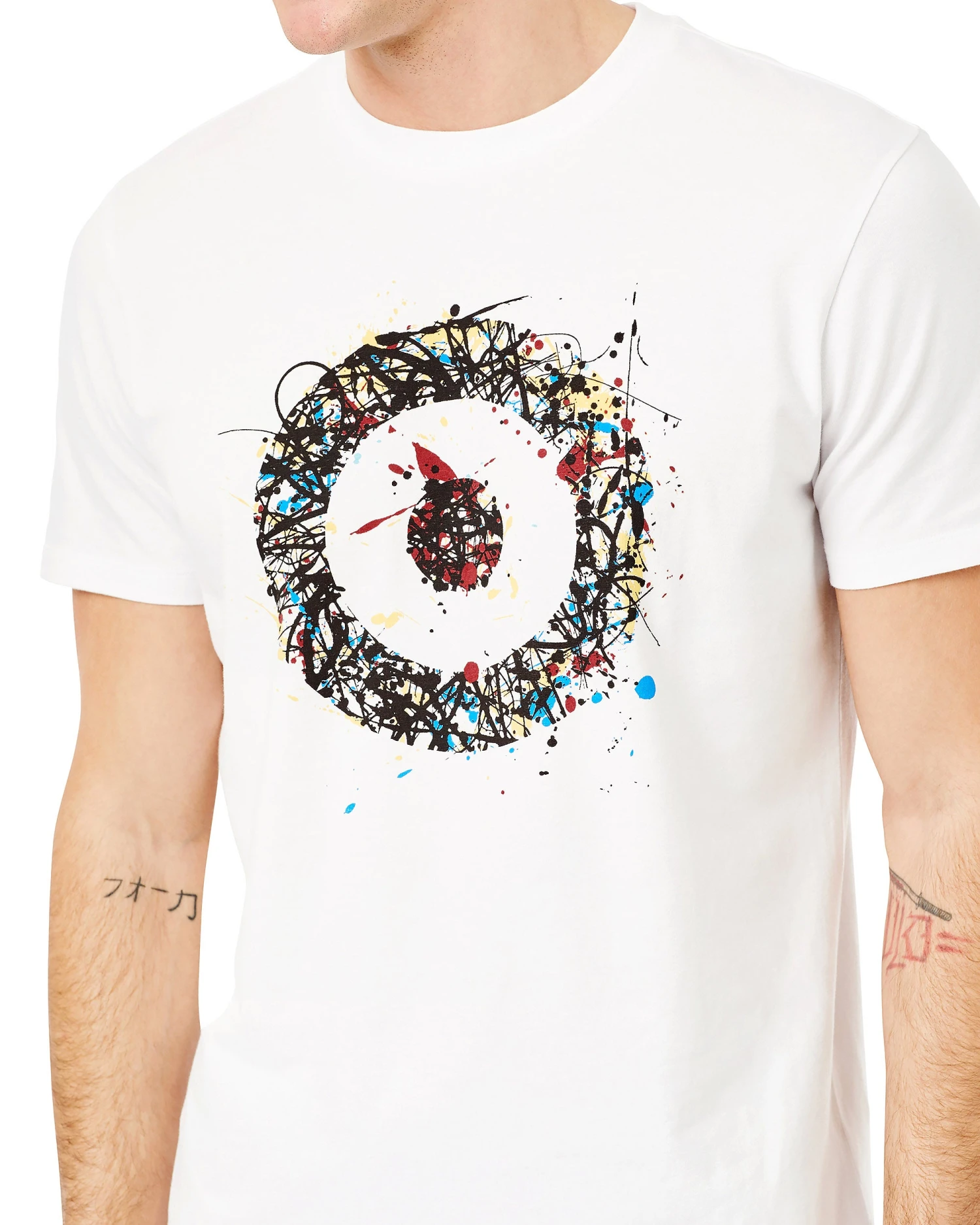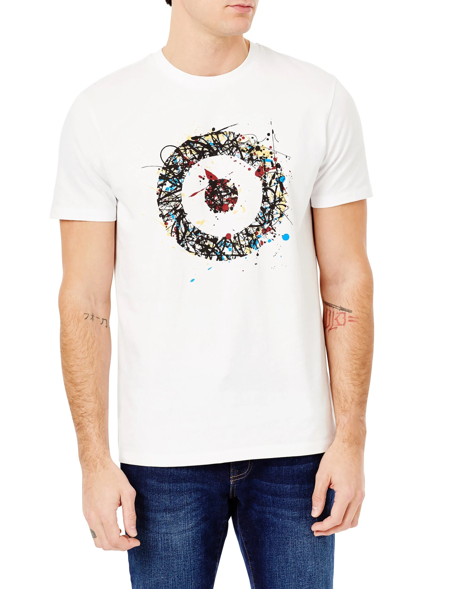 This printed tee is a crewneck style that features a splatter-painted target graphic.