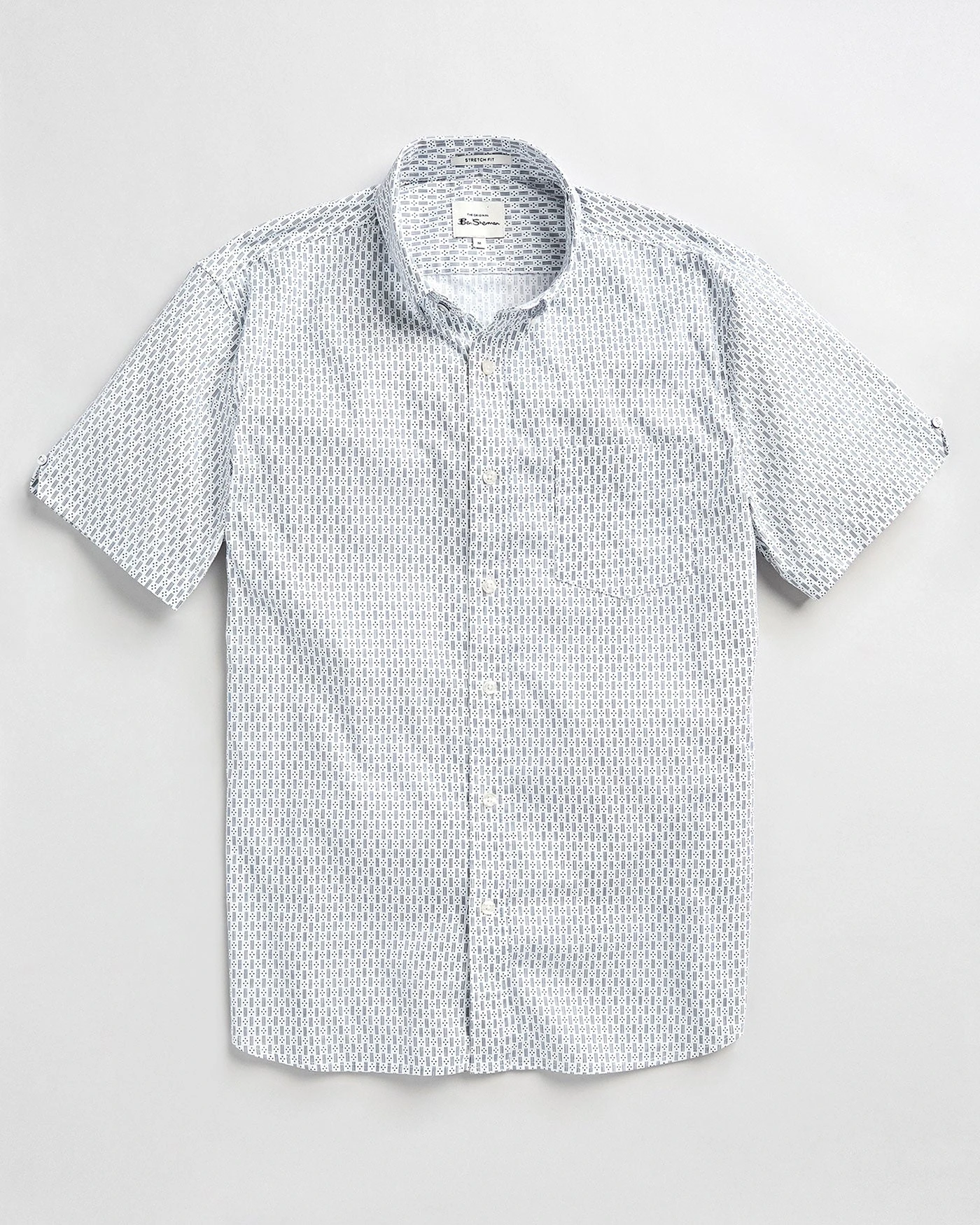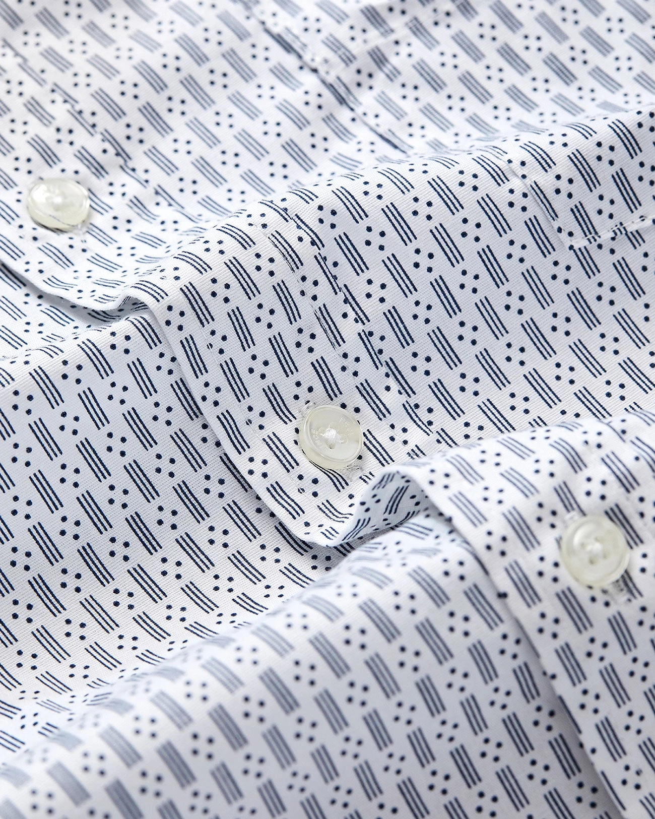 Our short-sleeve spot-dash pattern shirt features classic shirt details, like a two-finger button-down collar, tab-branded front chest pocket, and a mod fit.