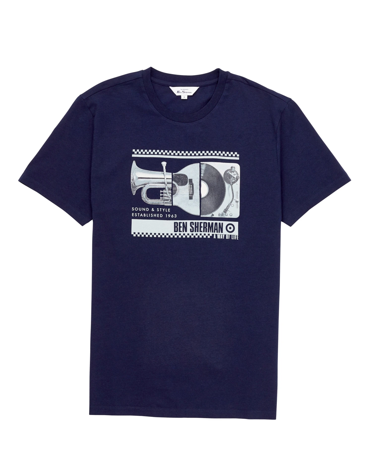 This printed tee is a crewneck style that features a spliced-musical-image graphic.