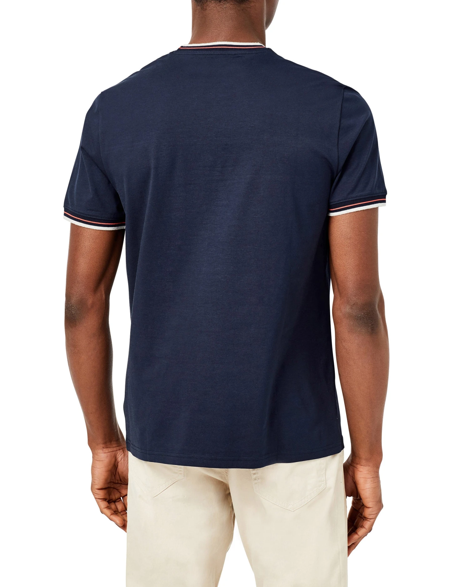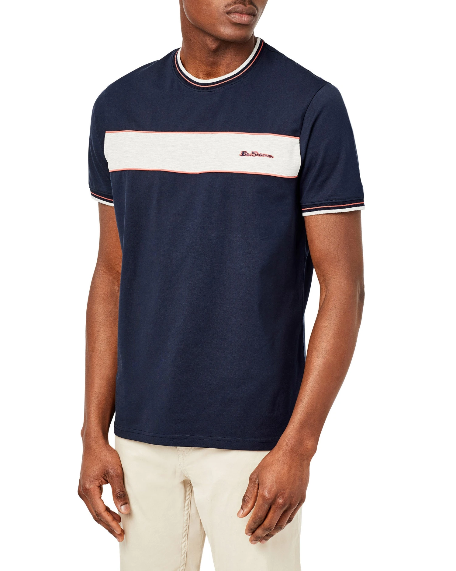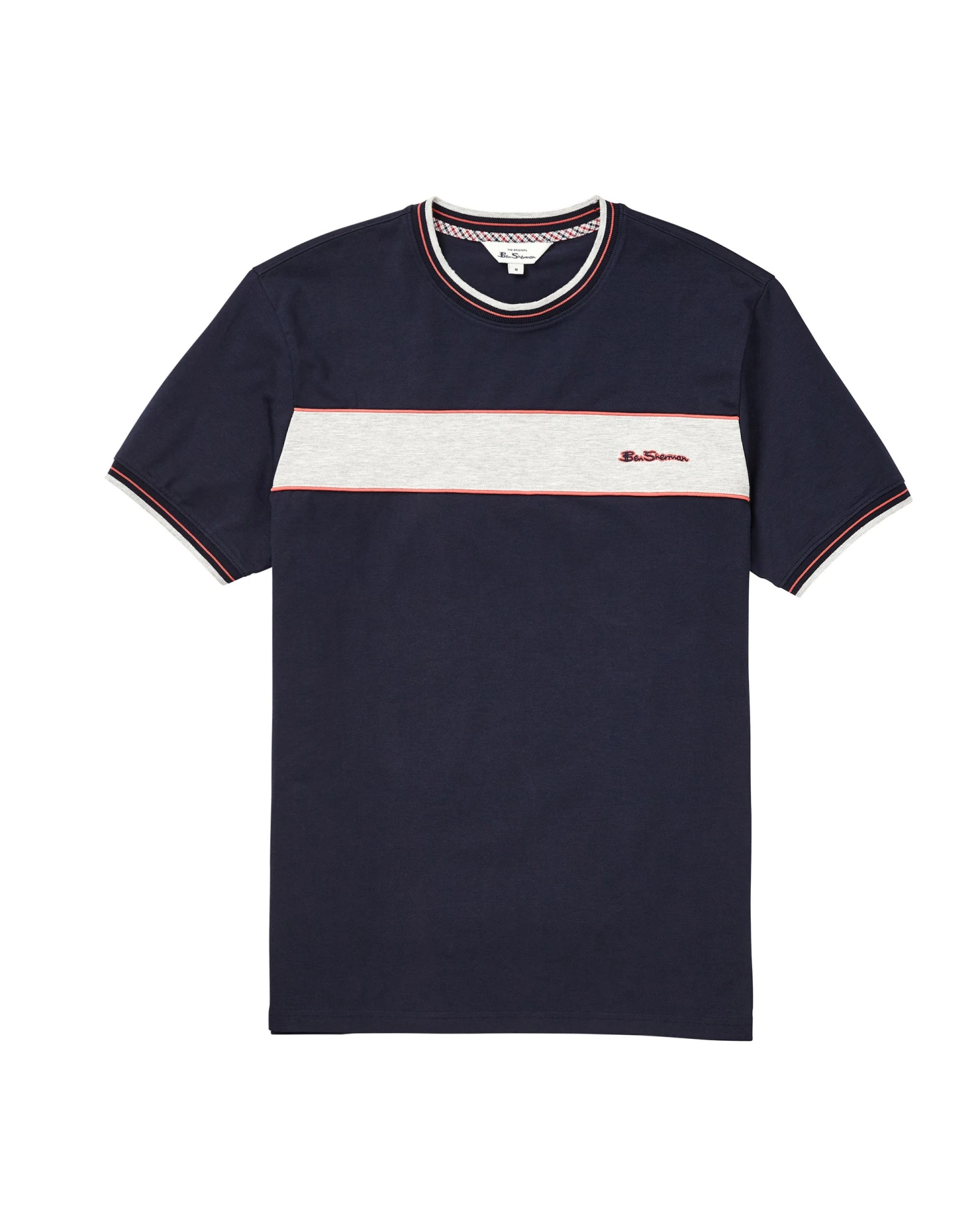 Our chest-stripe crew tee is a closet mainstay. This classic crewneck t-shirt is effortlessly cool and comfortable in a soft-touch Supima cotton with grey and red stripes across the chest.