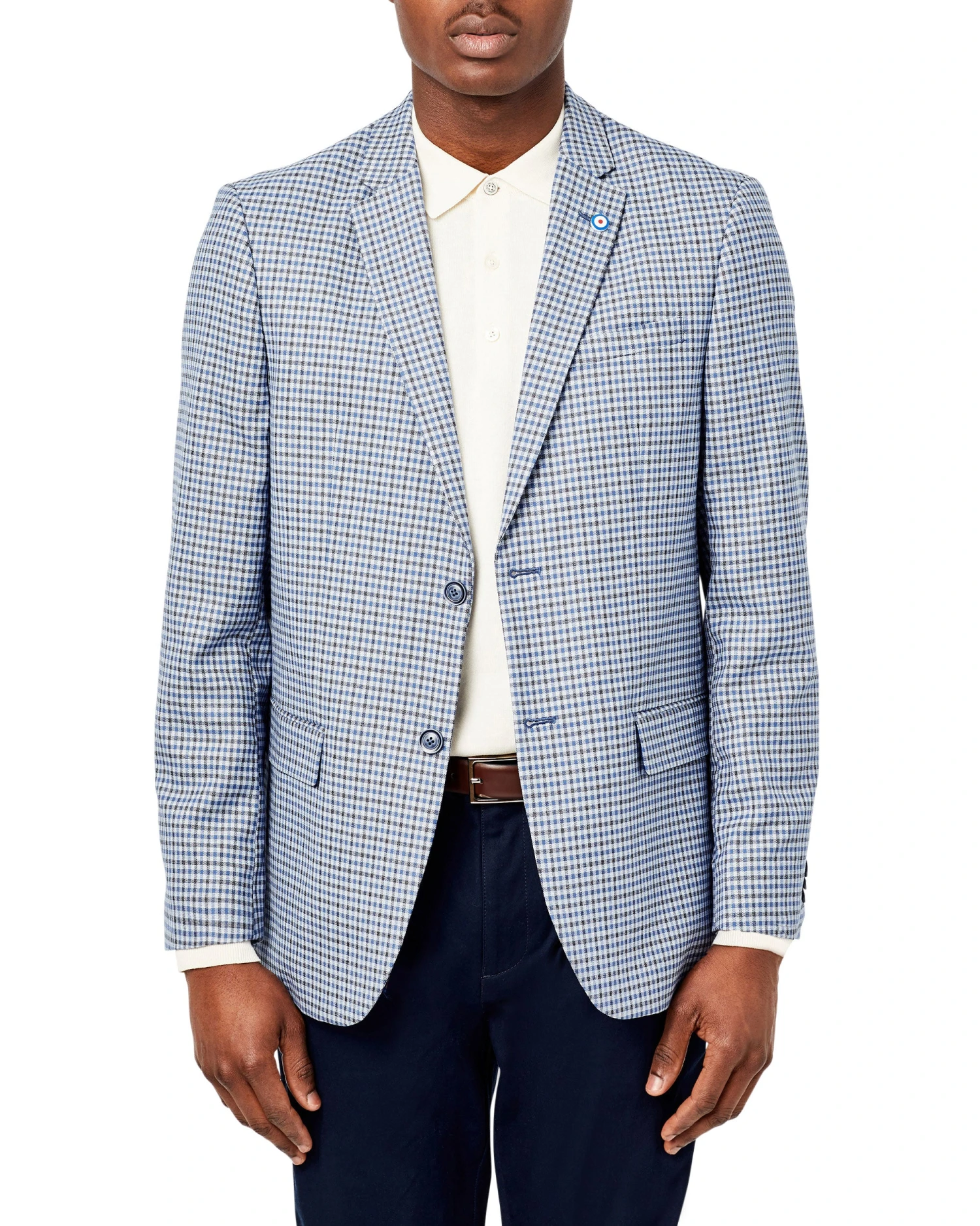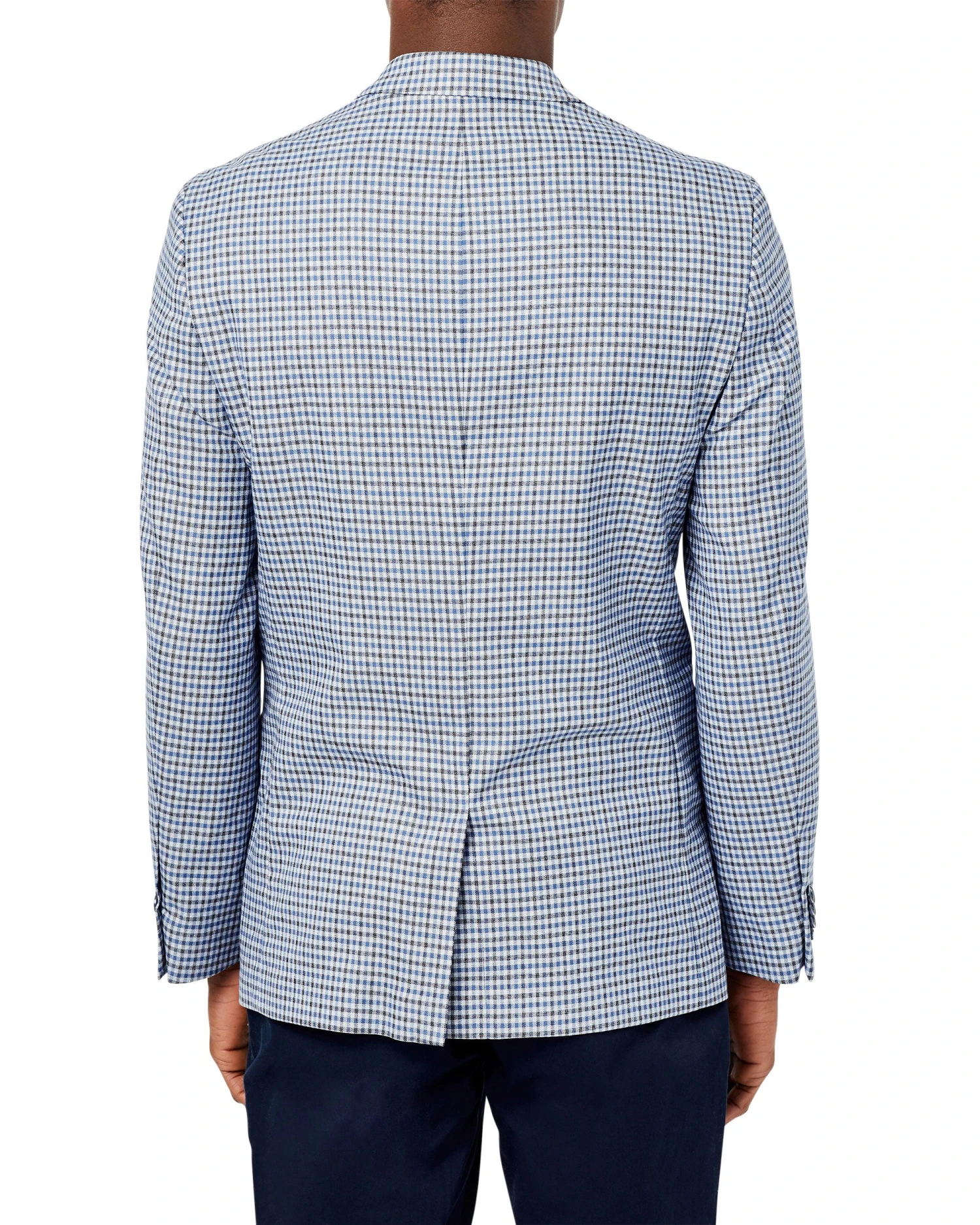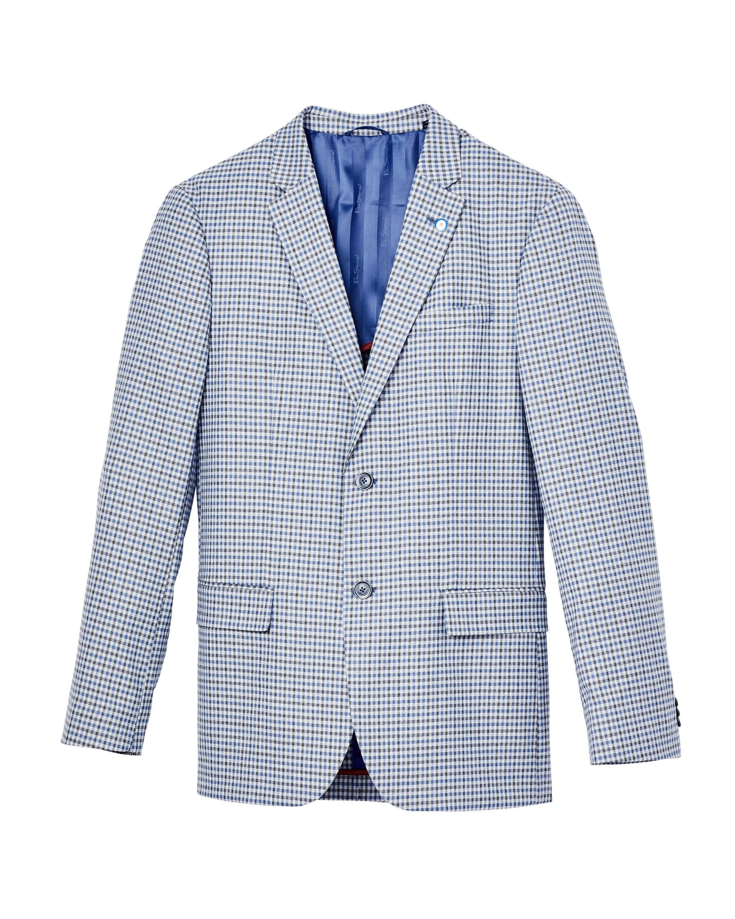 Kick your casual look up a notch with this two-button unconstructed jacket, featuring two-button fastening in front and flap-pockets. A pin-stripe checkered pattern adds interest to the look.