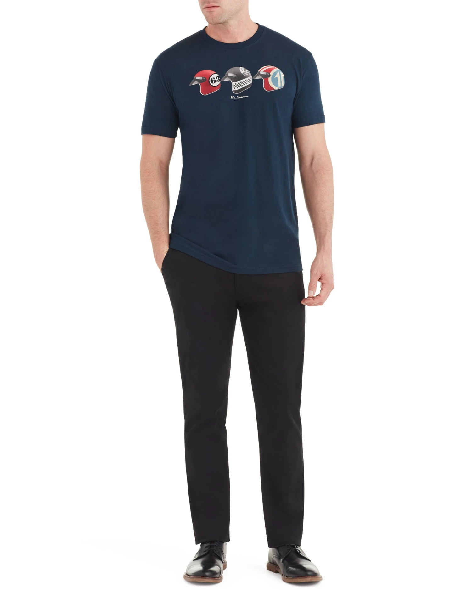 This t-shirt features a graphic with helmets worn by original mod scooters in the early 1960s.