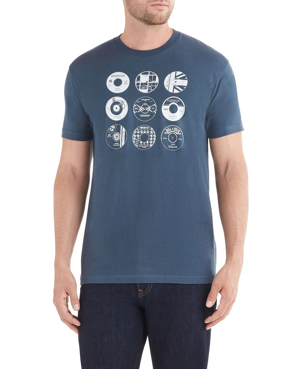 A British music theme prevails in this graphic tee. The CD print is a cool nod to mod and music culture.