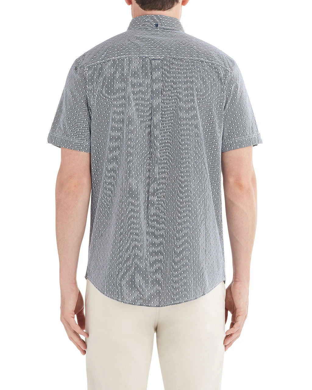 This button-down shirt has a unique print with a mix of polka dots and stripes. It has a vertical texture for a unique feel. White and grey keep the color palette neutral so you can pair it with whatever accessories you’re feeling.