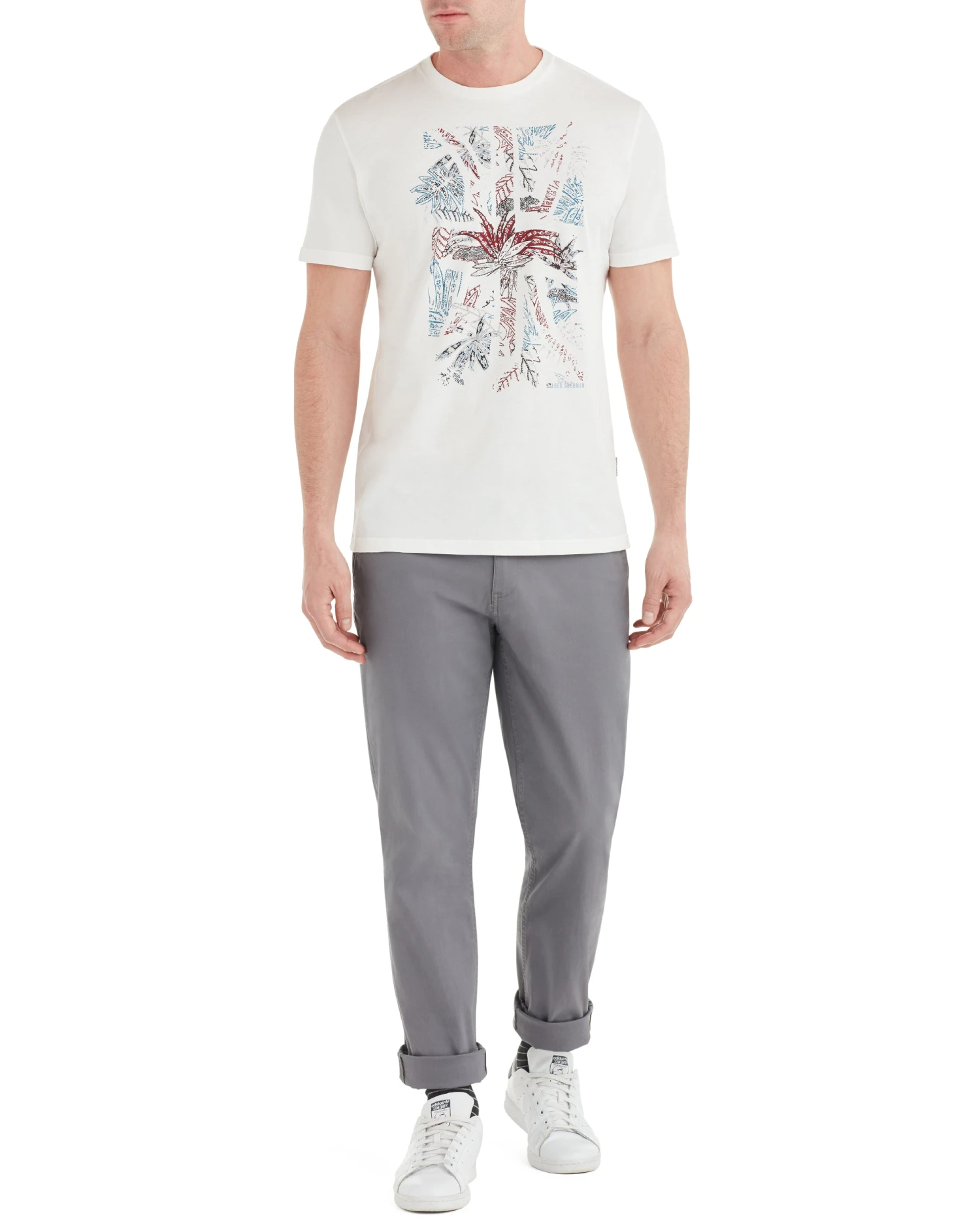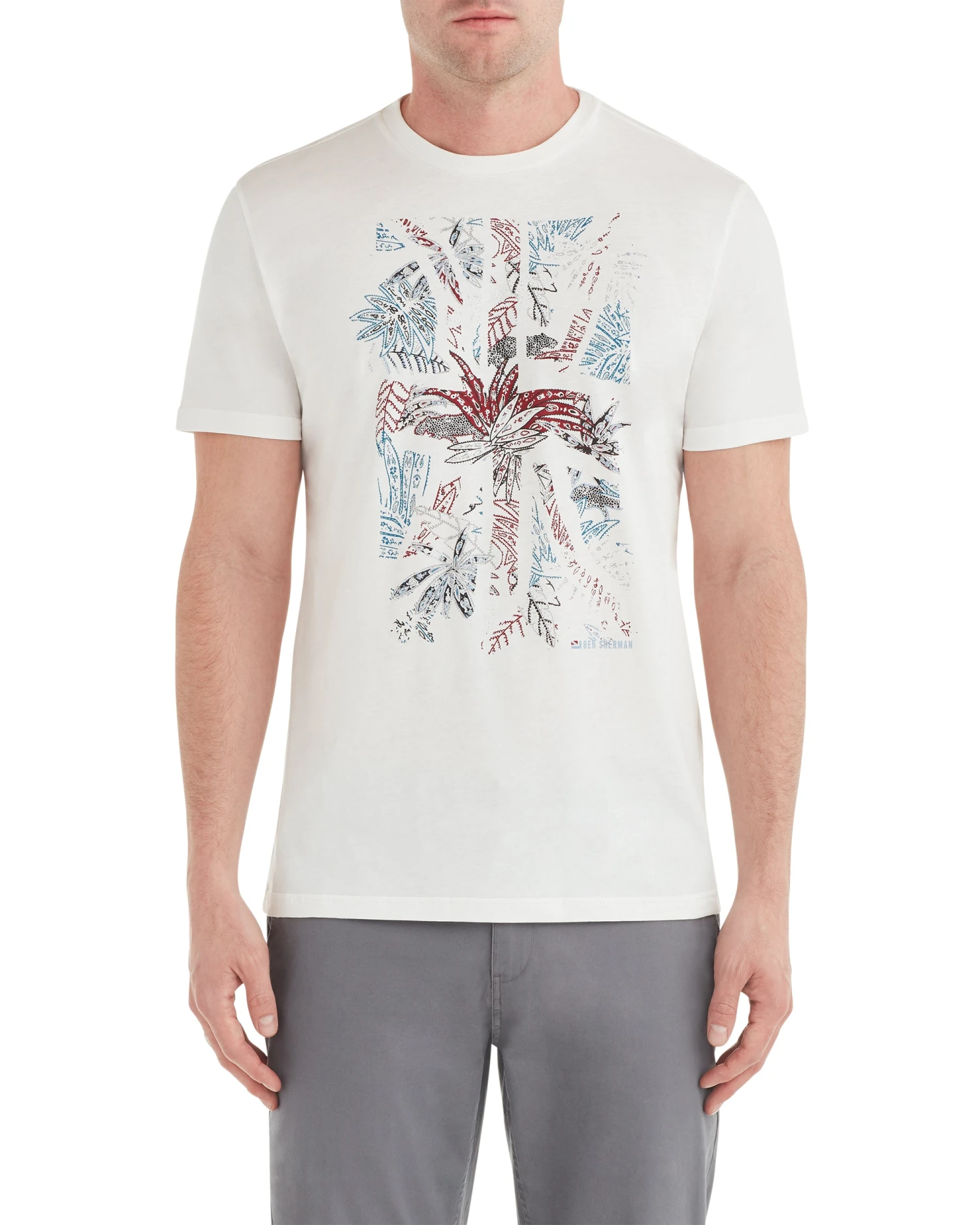 The graphic on this cool tee is an update of the Union Jack flag with a ’50s Riviera tropical print.